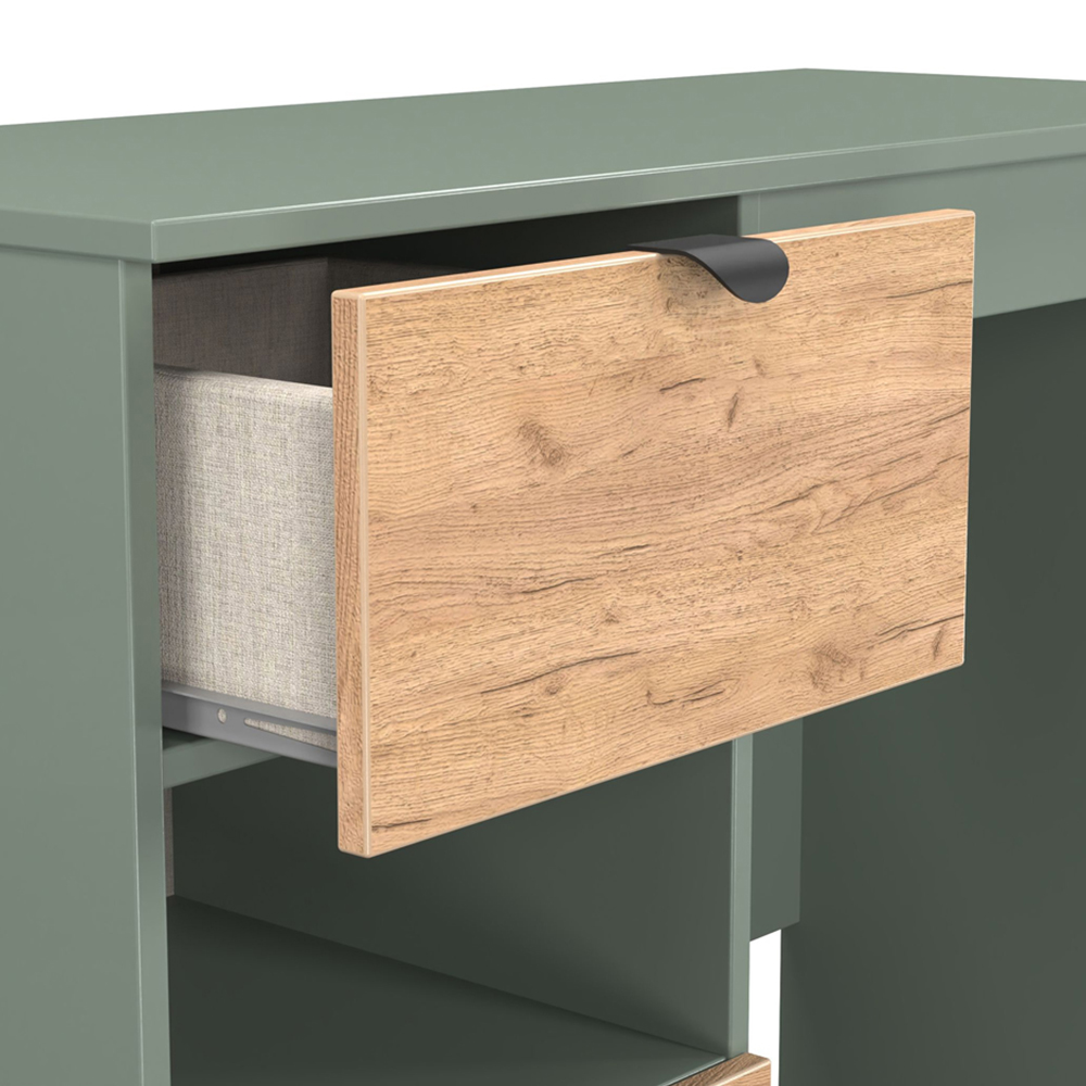 This Dressing Table/Vanity comes with 2 storage drawers (one regular depth and one deep) with an open shelf storage area for added practicality. Looking for something a bit different, then this range of furniture should be what you are looking for. Incorporating open shelf storage into it's design make sit one of our most practical ranges without sacrificing it's clean elegant style. This is also enhanced by the contemporary black metal handles. Guaranteed to stand out in any modern home. All our furniture is made in the United Kingdom, to the highest quality. It is delivered direct to your location of choice by one of our two man delivery teams, and come full assembled (although legs may be removed to prevent damage in transit).