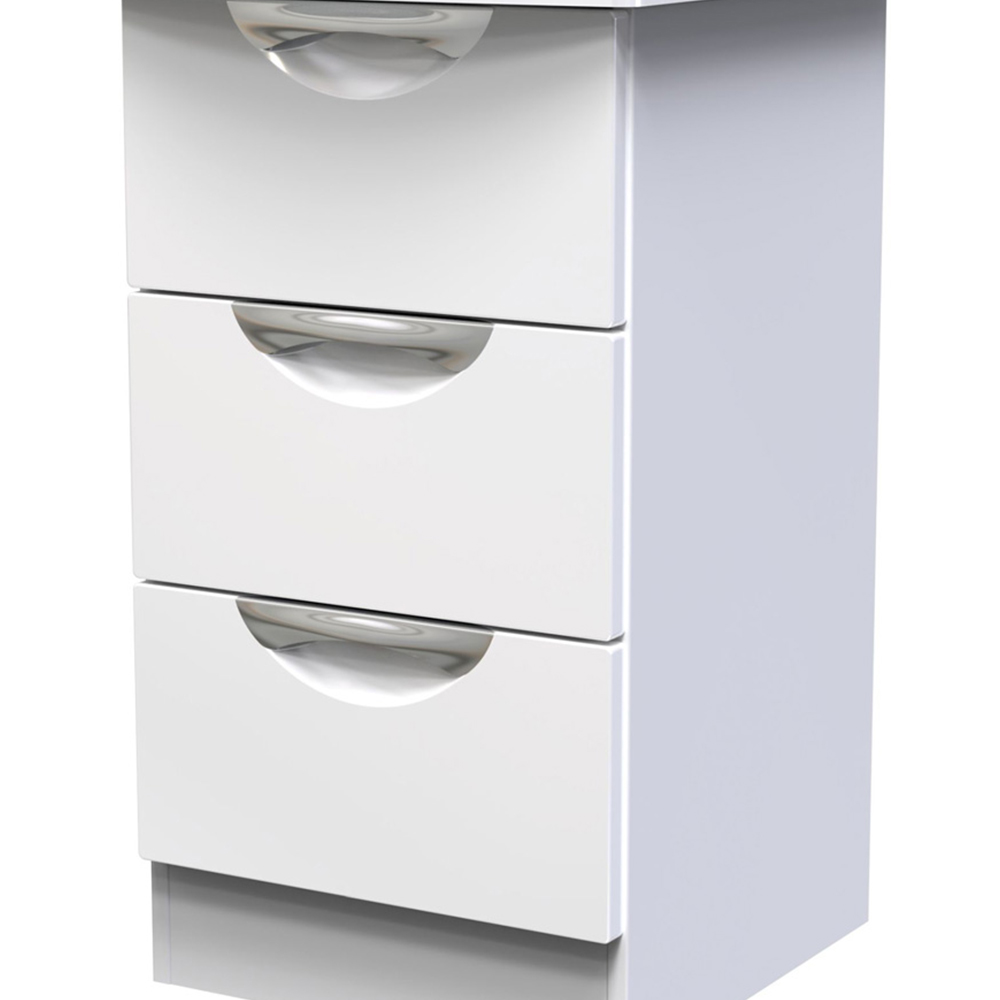The Crowndale Camden three Drawer White Gloss Bedside Cabinet is a practical and stylish piece of furniture. It features line effect drawer linings and smooth metal runners, ensuring easy and smooth operation. This bedside cabinet is perfect for any bedside or can be used as a free-standing storage unit. With its clean and contemporary look, it seamlessly blends into any modern home decor. The furniture range offers ample storage space for items of all sizes, helping you keep your room neat and tidy. The scratch-resistant veneer ensures durability and longevity, while the various colour options of the drawers and doors, along with the distinctive cut-out handles, add a touch of style. It also comes with a smooth gloss finish and indented metal handles, adding to its overall appeal.