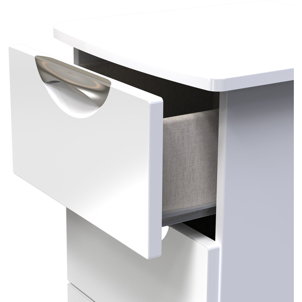 The Crowndale Camden five Drawer White Gloss Bedside Cabinet is a practical and stylish piece of furniture. It features line effect drawer linings and smooth metal runners, ensuring easy and smooth operation. This bedside cabinet is perfect for any bedside or can be used as a free-standing storage unit. With its clean and contemporary look, it seamlessly blends into any modern home decor. The furniture range offers ample storage space for items of all sizes, helping you keep your room neat and tidy. The scratch-resistant veneer ensures durability and longevity, while the various colour options of the drawers and doors, along with the distinctive cut-out handles, add a touch of style. It also comes with a smooth gloss finish and indented metal handles, adding to its overall appeal.
