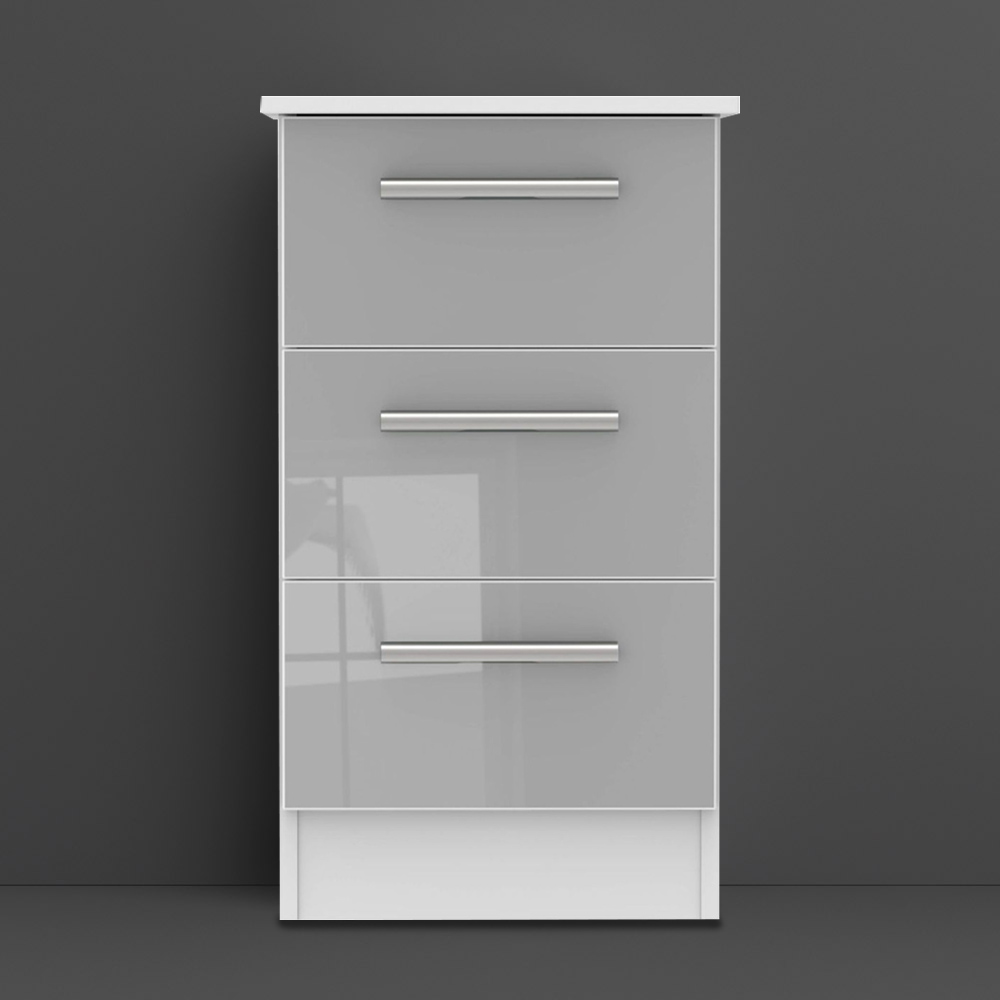 Create your dream bedroom and enhance its beauty in style with this practical yet stylish Crowndale Contrast Ready Assembled Bedside Cabinet. Made up of high-quality materials and long-lasting finishes, it features three drawers with line-effect drawer linings and smooth metal runners. Carrying a stylish Grey and White Matt finish, the fronts are complemented by sleek designer-style metal handles and when you open the drawers, you'll notice the smooth metal runners and linen-look interior. Made in the United Kingdom of the highest quality, it comes fully assembled for hassle-free usage.