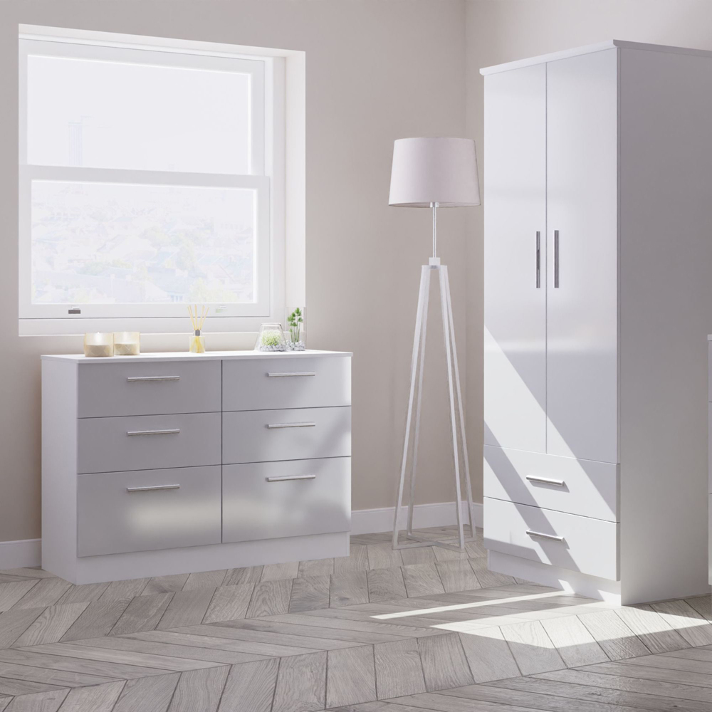 Create your dream bedroom and enhance its beauty in style with this practical yet stylish Crowndale Contrast Ready Assembled Tall Wardrobe. Made up of high-quality materials and long-lasting finishes, it features a double-door design with a full-width hanging rail and upper shelf. Carrying a stylish Grey and White Matt finish, the fronts are complemented by sleek designer-style metal handles and when you open the drawers, you'll notice the smooth metal runners and linen-look interior. Made in the United Kingdom of the highest quality, it comes fully assembled for hassle-free usage.