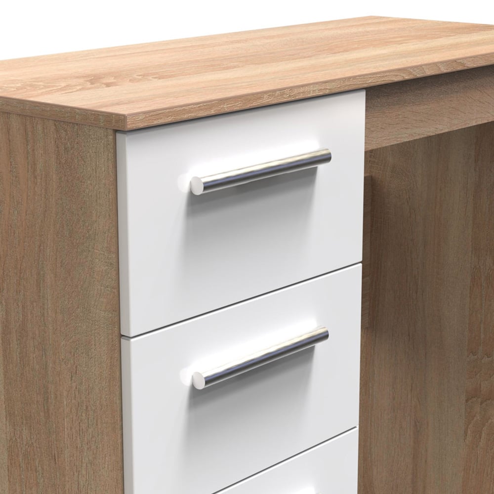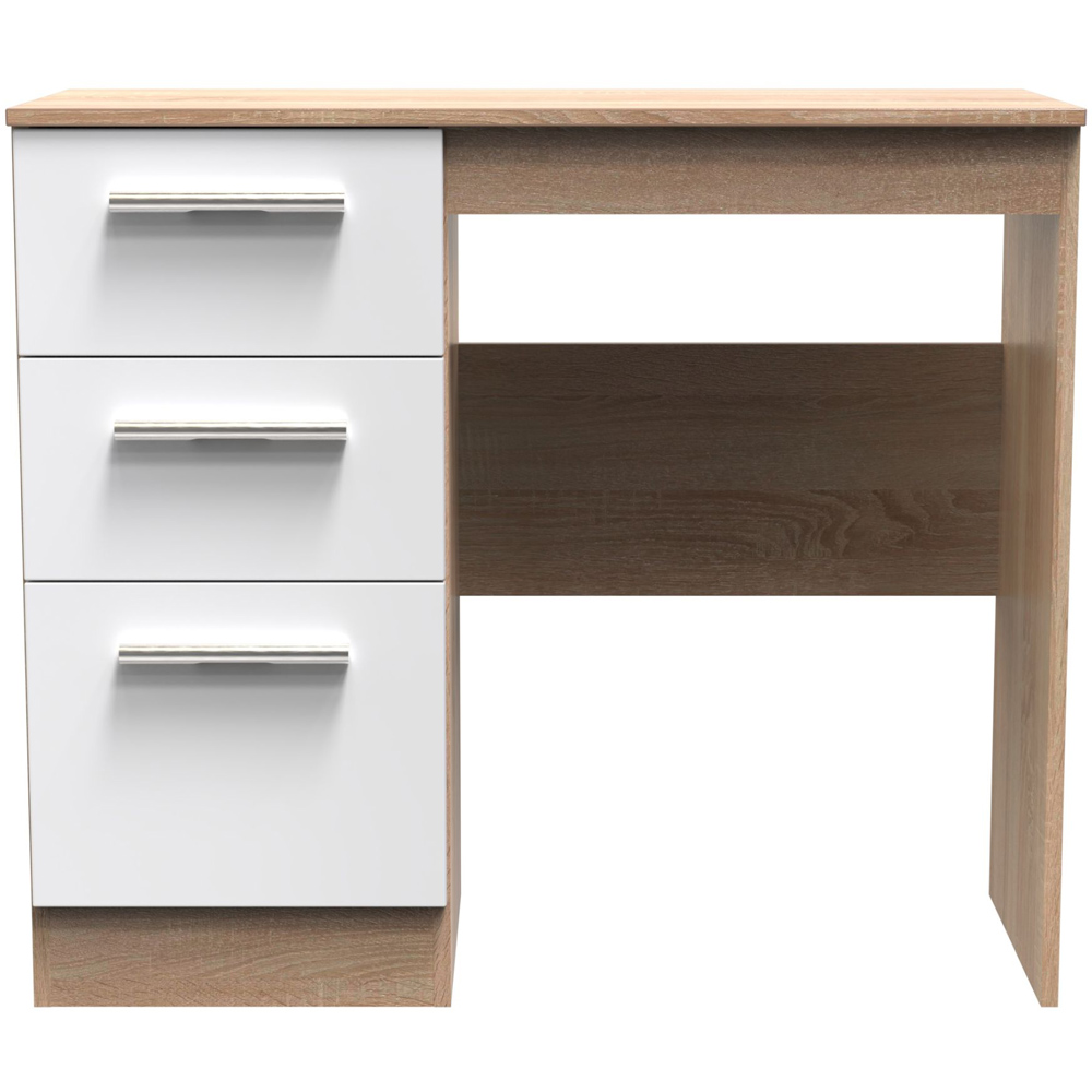 Create your dream bedroom and enhance its beauty in style with this practical yet stylish Crowndale Contrast 3 Drawer White Bardolino Oak Vanity Dressing Table. Made up of high-quality materials and long-lasting finishes, it features three drawers with line-effect drawer linings and smooth metal runners. Carrying a stylish white and Bardolino oak finish, the fronts are complemented by sleek designer-style metal handles and when you open the drawers, you'll notice the smooth metal runners and linen-look interior. Made in the United Kingdom of the highest quality, it comes fully assembled for hassle-free usage.