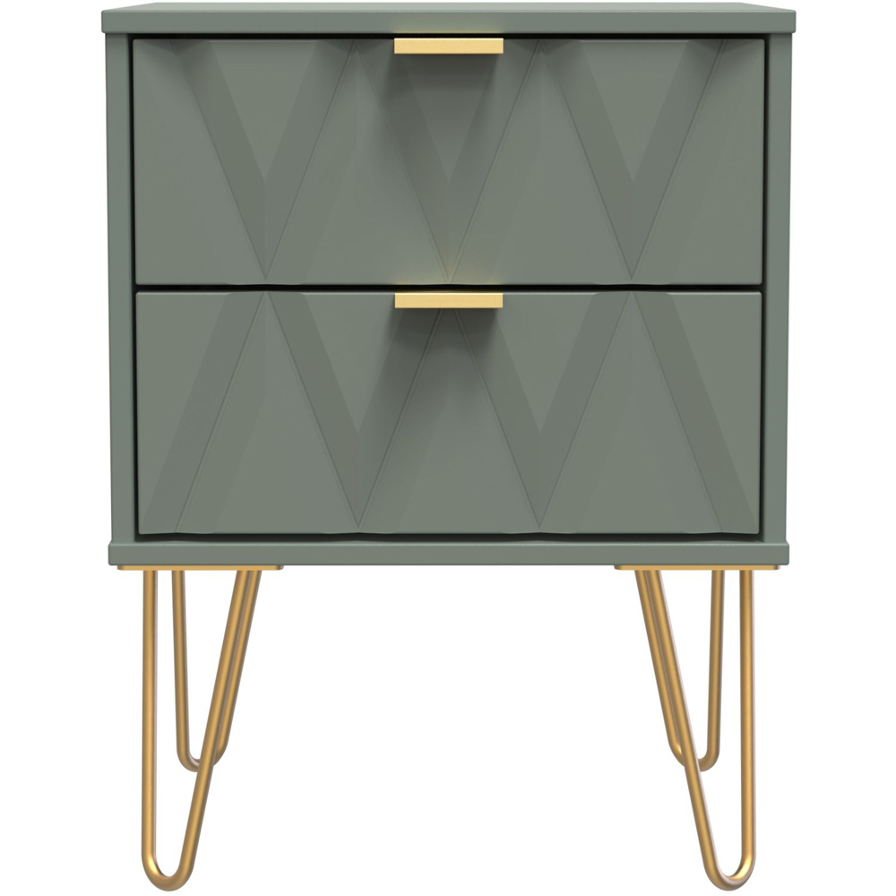 Organise your nighttime essentials with the Crowndale Diamond 2-drawer Reed Green Bedside Cabinet. Practical and stylish, this two-drawer bedside cabinet features line-effect drawer linings and smooth metal runners. The unit works perfectly as a bedside or as a free-standing storage unit. Contemporary and chic, with distinctively patterned drawers and a classic colour, this bedside cabinet is sure to complement any interior design. Also, finished with gold metal handles and sturdy hairpin legs, it makes an elegant addition to any space. This piece of furniture comes fully assembled (although legs may be removed to prevent damage in transit).