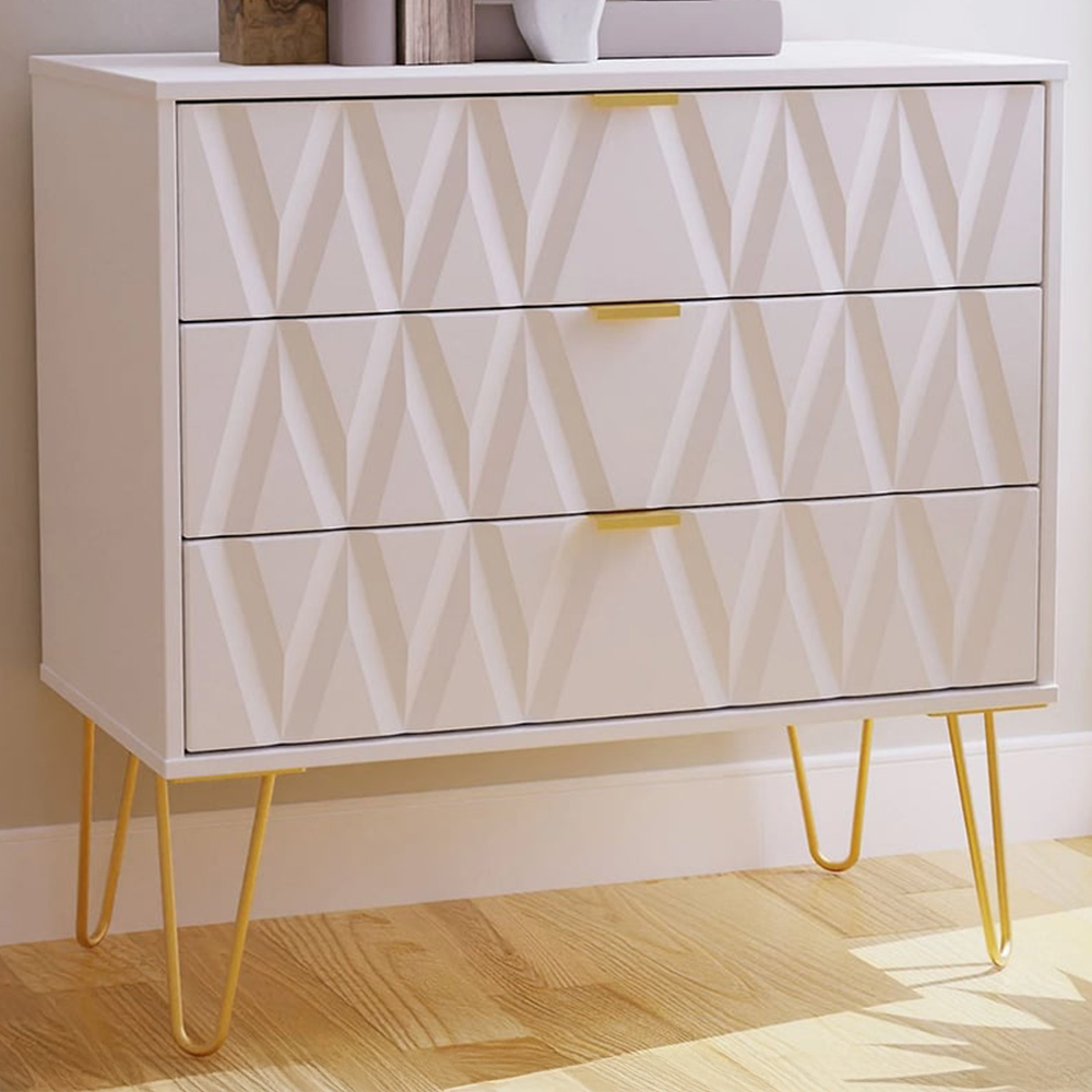 Declutter your space in style with the Crowndale Diamond 3-drawer Matt White Storage Chest. Practical and stylish, this three-drawer storage chest features line-effect drawer linings and smooth metal runners. The unit works perfectly as a free-standing storage unit. Contemporary and chic, with distinctively patterned drawers and a classic colour, this unit is sure to complement any interior design. Also, finished with gold metal handles and sturdy hairpin legs, it makes an elegant addition to any space. Plus, it comes with a tabletop to display your favourites in style. This piece of furniture comes fully assembled (although legs may be removed to prevent damage in transit).