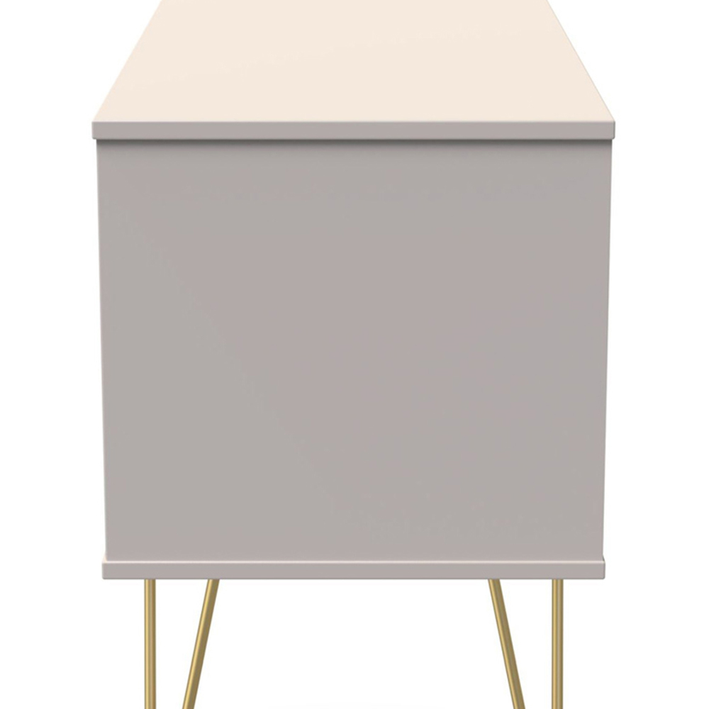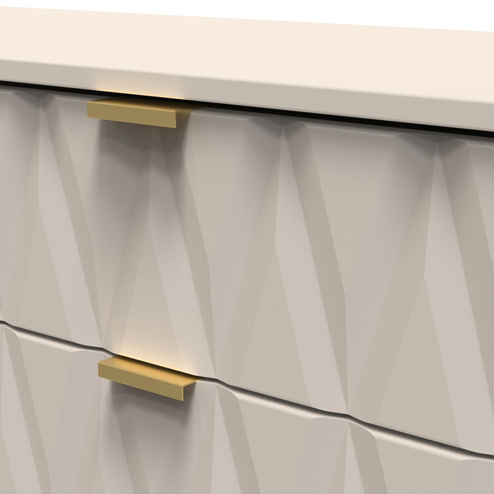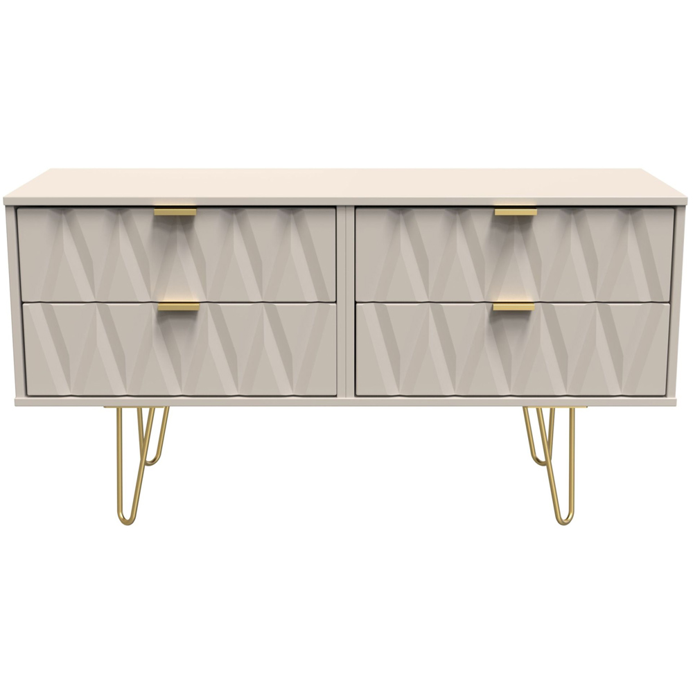 Get your indoors organised in style with this Crowndale Diamond 4 Drawer Matt Kashmir Chest of Drawers. This large four-drawer bed box is a perfect storage solution for any room (not just the end of your bed). Also, it features line effect drawer lining and smooth metal runners for added convenience. Featuring a long tabletop, this unit can also be used as a low-level TV or media stand as it perfectly holds TVs up to 50 inches. Contemporary and chic, with distinctively patterned drawers and a classic colour, this unit is sure to complement any interior design. Also, finished with gold metal handles and sturdy hairpin legs, it makes an elegant addition to any space. This piece of furniture comes fully assembled (although legs may be removed to prevent damage in transit).