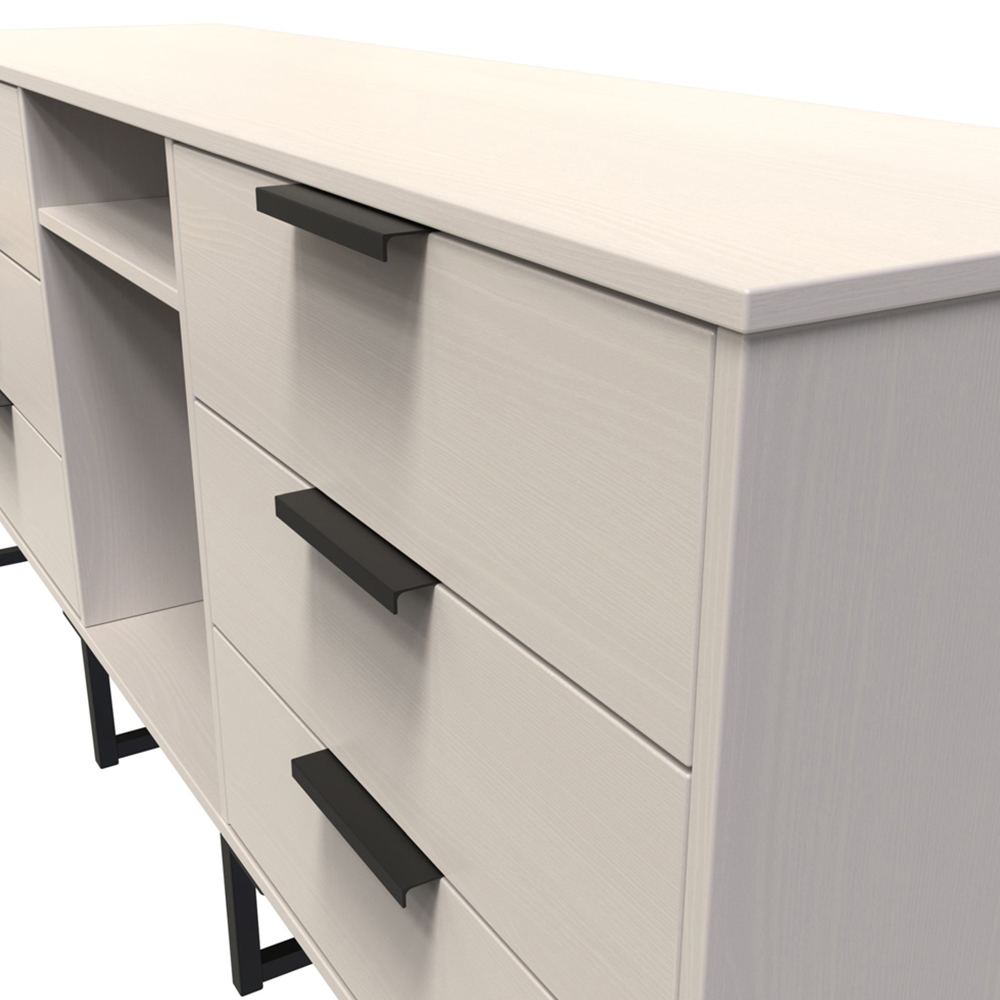 Organise your space with this Crowndale Hong Kong 6-drawer Kashmir Ash Media Unit. This wide storage unit features six storage drawers with a central shelf, line effect drawer linings and smooth metal runners. Suitable for use as a media unit or sideboard, this storage unit comes with a long tabletop ideal for TVs up to 70 inches. Also, the modern, stylish unit is available in a durable scratch-resistant colour or finish. For added convenience, it comes with pull handles on all doors and drawers, with black sleigh metal legs. Plus, all drawers come with long-lasting metal drawer runners and a linen-effect interior. This piece of furniture comes fully assembled (although legs may be removed to prevent damage in transit).