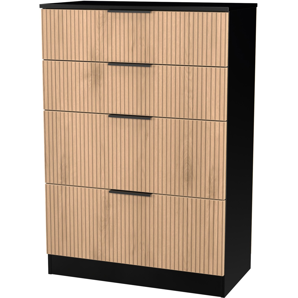 This deep 4 drawer chest of drawers is practical and stylish. Perfect for any home as a free standing storage unit. Combining both simple elegance with modern styling, this new range comes with a striking slatted effect front, sturdy black metal handles and smooth metal drawer runners. Perfect for any modern home. All our furniture is made in the United Kingdom, to the highest quality. It is delivered direct to your location of choice by one of our two man delivery teams, and come full assembled (although legs may be removed to prevent damage in transit).