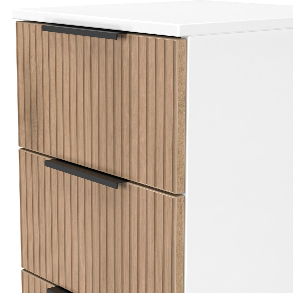 This 4 drawer tall bedside cabinet is practical and stylish. Perfect for any bedside or as a free standing storage unit. Combining both simple elegance with modern styling, this new range comes with a striking slatted effect front, sturdy black metal handles and smooth metal drawer runners. Perfect for any modern home. All our furniture is made in the United Kingdom, to the highest quality. It is delivered direct to your location of choice by one of our two man delivery teams, and come full assembled (although legs may be removed to prevent damage in transit).