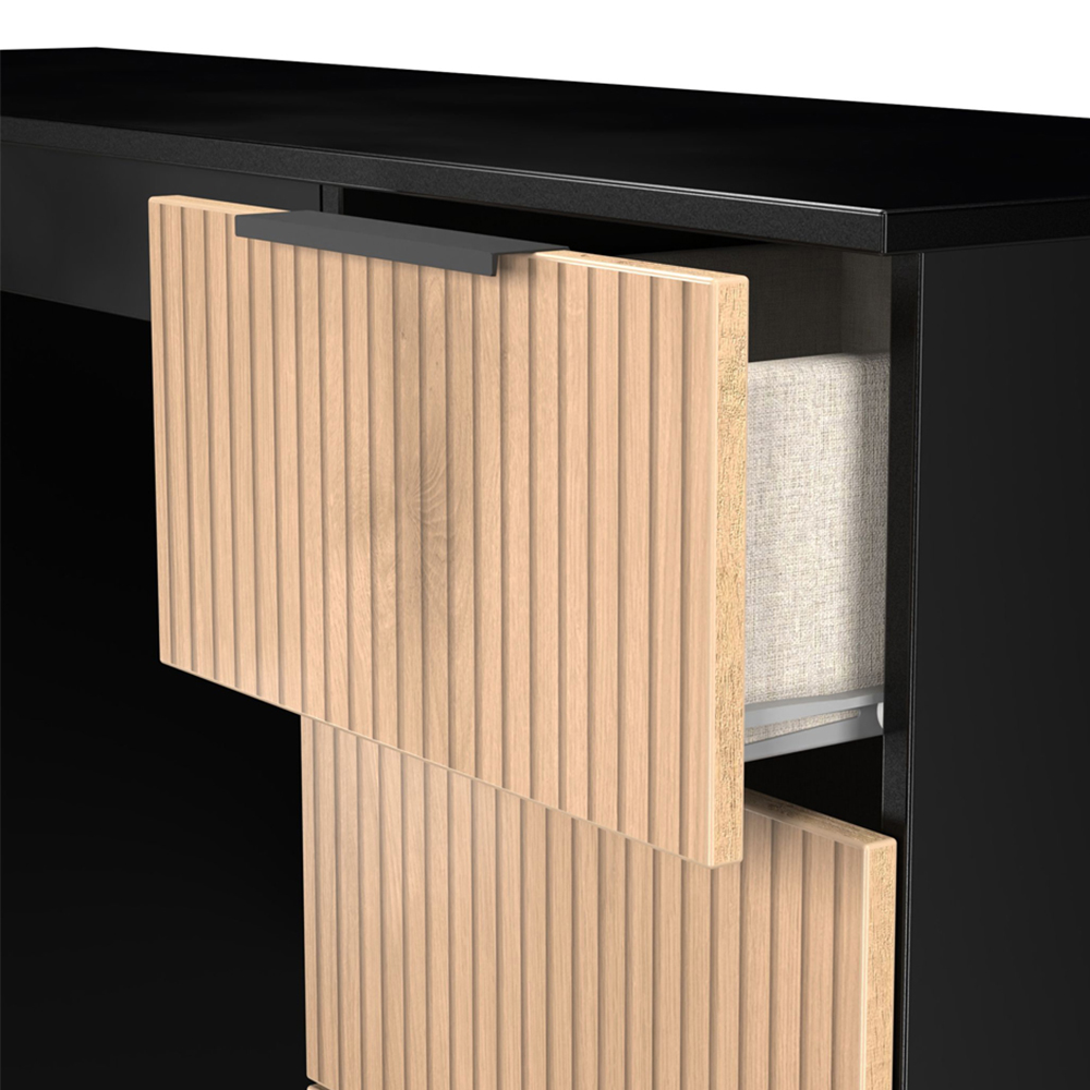 This practical 6 drawer kneehole desk/vanity is perfect for any bedroom or office. A matching stool and mirror are also available. Combining both simple elegance with modern styling, this new range comes with a striking slatted effect front, sturdy black metal handles and smooth metal drawer runners. Perfect for any modern home. All our furniture is made in the United Kingdom, to the highest quality. It is delivered direct to your location of choice by one of our two man delivery teams, and come full assembled (although legs may be removed to prevent damage in transit).