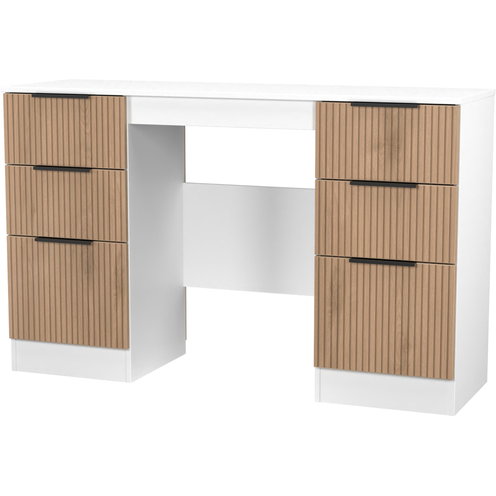 This practical 6 drawer kneehole desk/vanity is perfect for any bedroom or office. A matching stool and mirror are also available. Combining both simple elegance with modern styling, this new range comes with a striking slatted effect front, sturdy black metal handles and smooth metal drawer runners. Perfect for any modern home. All our furniture is made in the United Kingdom, to the highest quality. It is delivered direct to your location of choice by one of our two man delivery teams, and come full assembled (although legs may be removed to prevent damage in transit).