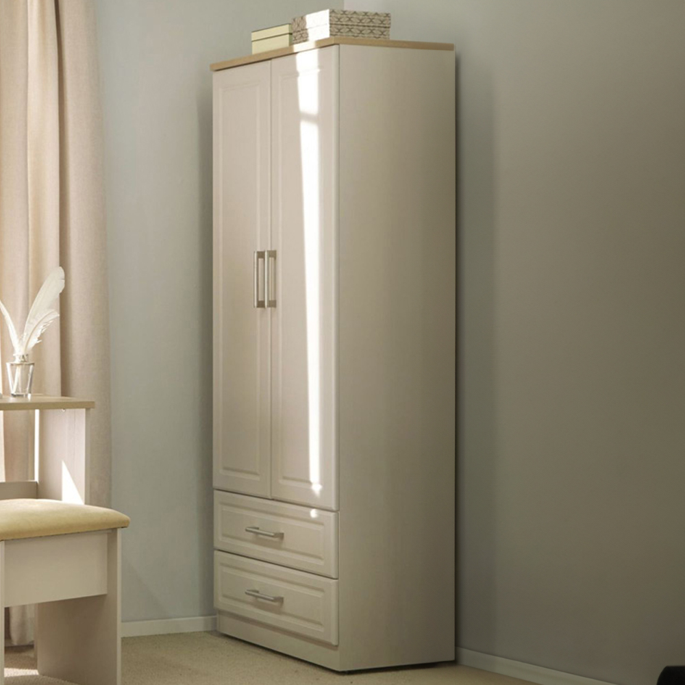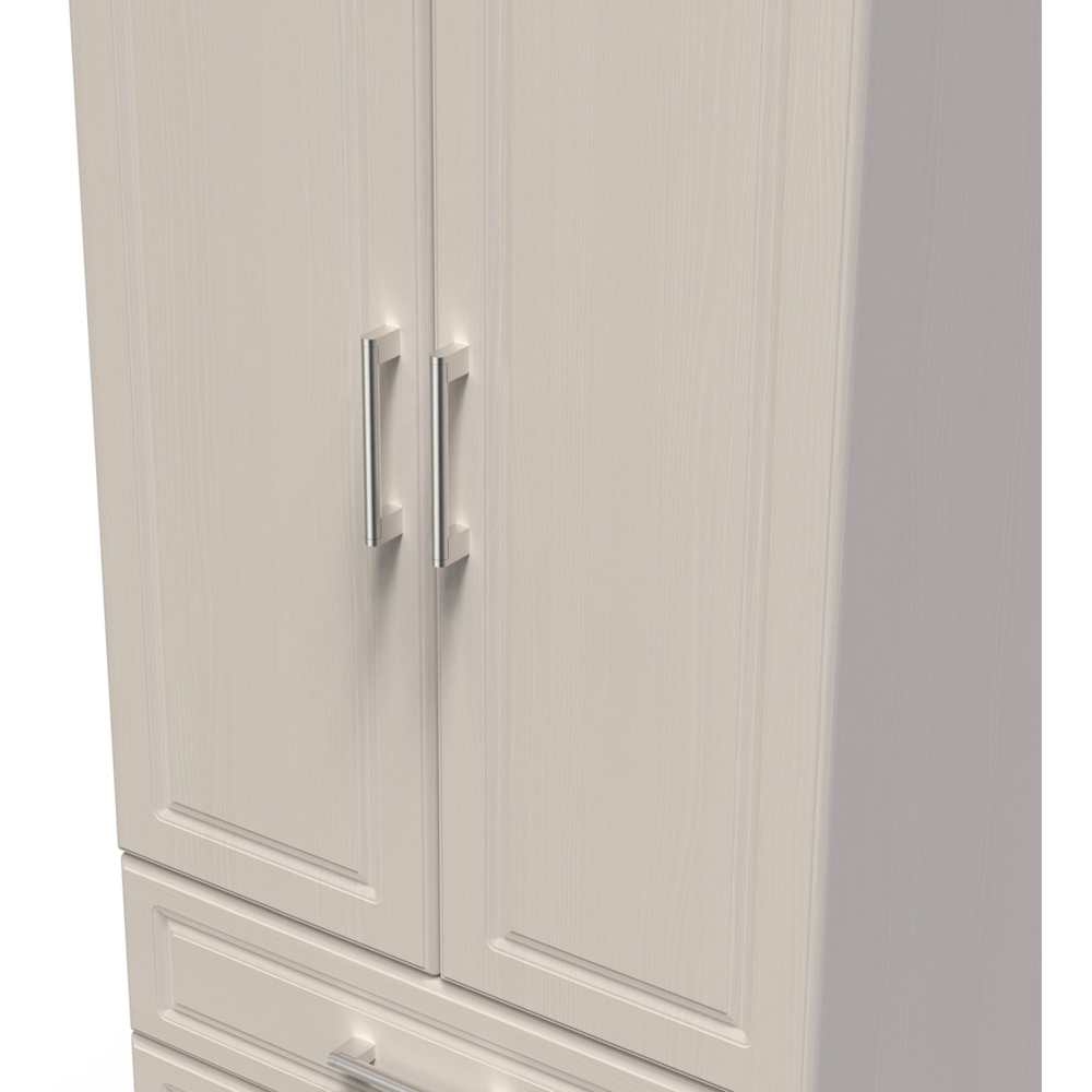 The Crowndale Kent 2 Door 2 Drawer Kashmir Ash and Modern Oak Wardrobe is an ideal choice for any bedroom. It offers ample storage space with a full-width hanging rail and two full-width drawers. The Kent range showcases a classic design with traditional edge finishes and wood effect tops. The contrasting finishes, such as the brushed steel handles on wood-grained fronts, add a touch of elegance to the wardrobe. It comes fully assembled for your convenience. This wardrobe is ready to be enjoyed as soon as it arrives.