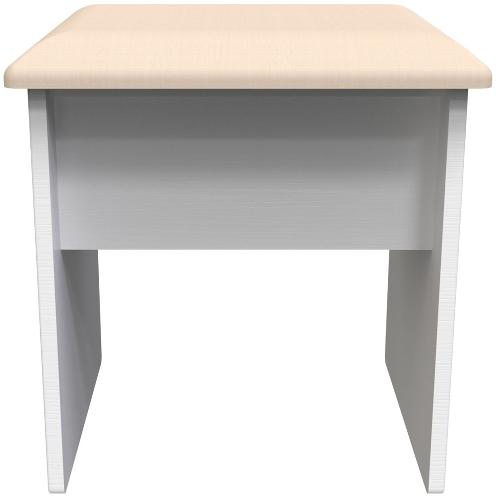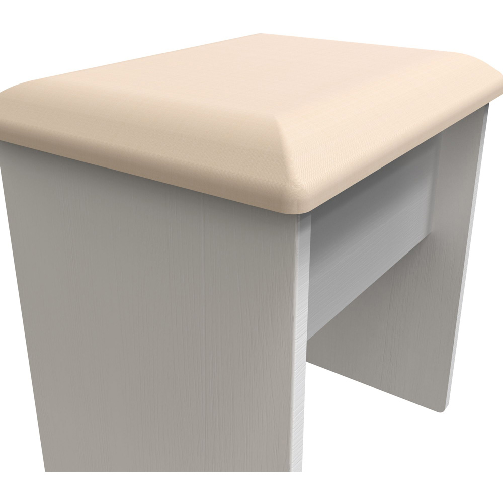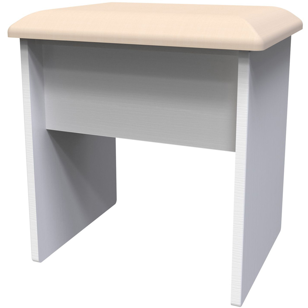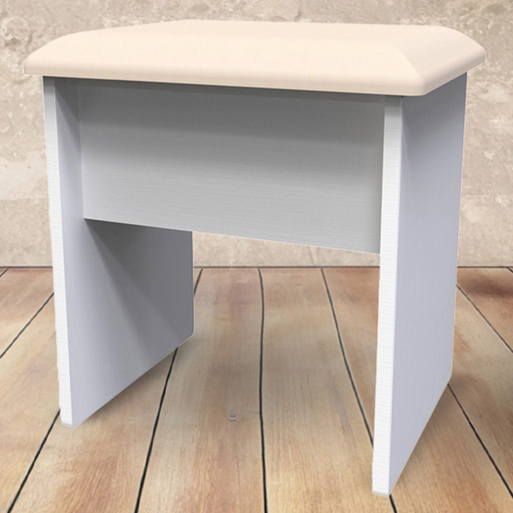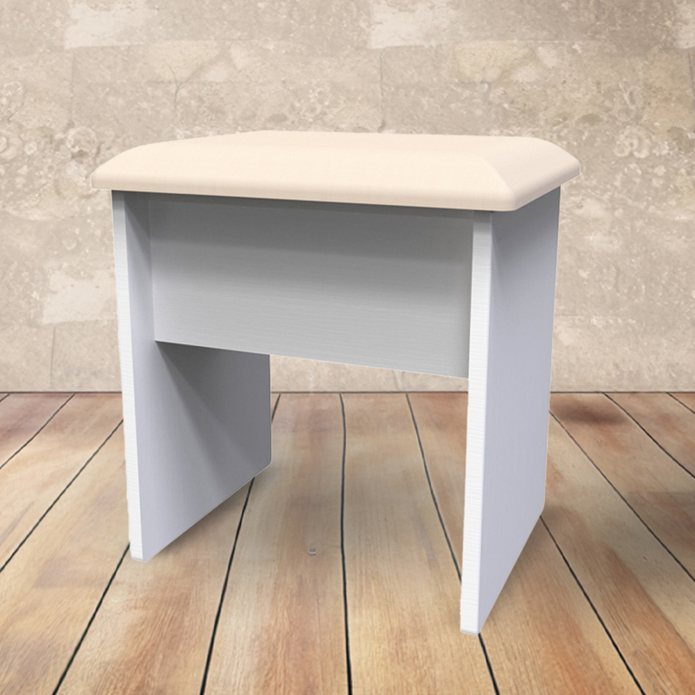 Add a touch of sophistication to any space with the Crowndale Kent White Ash Dressing Table Stool. It is a compact and elegant vanity stool. Its light and simple design is complemented by a soft cushioned seat, providing both comfort and durability. This stool is the perfect companion for a desk or vanity - showcasing traditional edge finishes and wood effect tops, giving it a timeless and classic look. The contrasting finishes, such as the brushed steel handles mounted on wood-grained fronts, create beautiful tonal variations. Experience the beauty and craftsmanship of the assembled stool today.