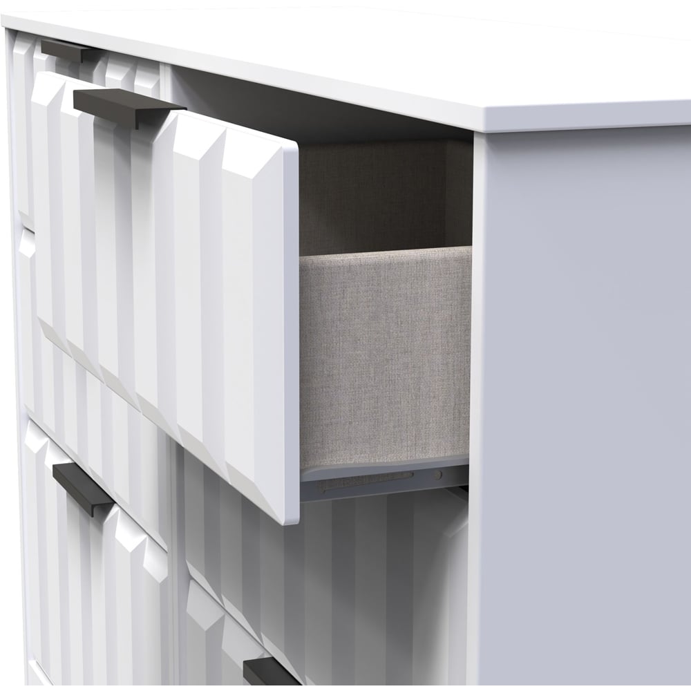 Looking for a practical and stylish chest of drawers to compliment or contrast your room? You can try this Crowndale New York 6 Drawer Matt White Chest of Drawers. The double-width chest of drawers comes in a lovely matt-white shade and features a distinct cube design. It has six drawers providing ample handy storage space and black metal pull handles that contrast the white chest. The drawers have smooth metal runners and linen-effect linings that add a charming final touch to this piece.