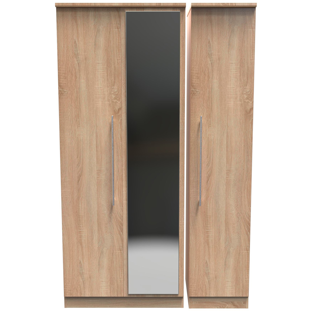 Add a touch of elegance to any bedroom with the Crowndale Sherwood 3-Door Bardolino Oak Triple Mirror Wardrobe. This full-height wardrobe features three doors, including a full-height single mirrored door, providing both ample storage and a convenient dressing mirror. Each drawer is equipped with long-lasting metal runners and a linen-effect interior, ensuring durability and smooth operation. Crafted in the United Kingdom to the highest quality standards, this wardrobe combines functionality with timeless elegance, making it an ideal addition to any home.