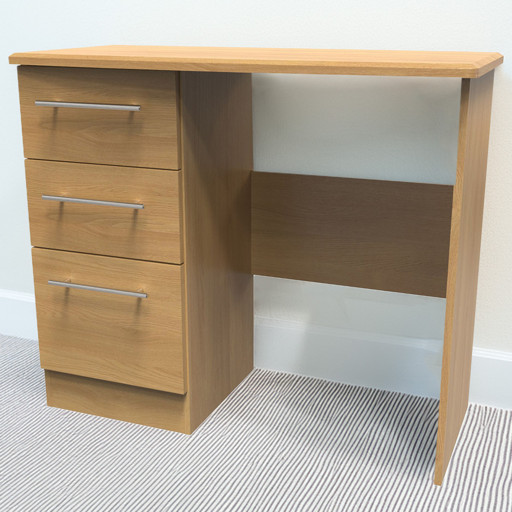 Make a practical and stylish addition to any bedroom or office with the Crowndale Sherwood 3 Drawer Oak Vanity Unit. This narrow desk or vanity features three spacious drawers, each adorned with sleek metal T-Bar handles. Designed for durability, all drawers are equipped with long-lasting metal runners and a linen-effect interior. Crafted in the United Kingdom to the highest quality standards, this elegant piece combines functionality with timeless elegance, making it a valuable addition to any space.