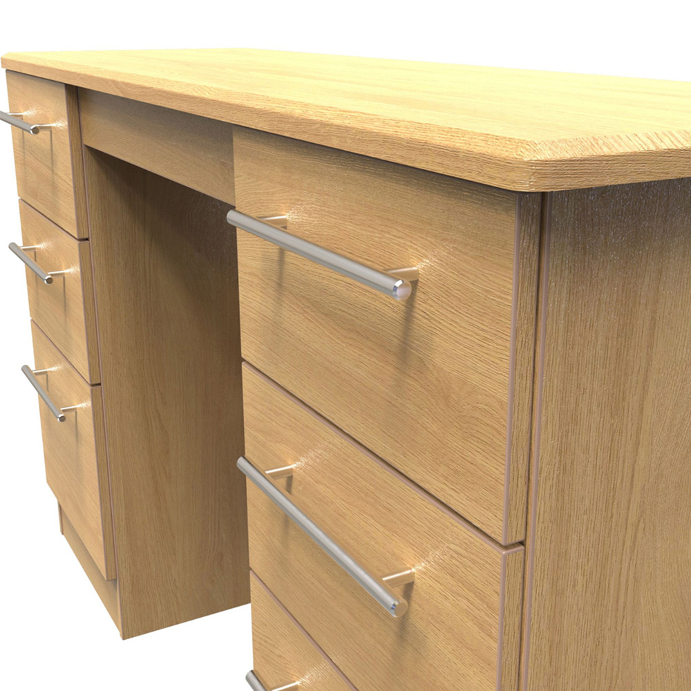 Make a stylish addition to any bedroom or office with the Crowndale Sherwood 6-Drawer Oak Kneehole Desk. This versatile piece features six spacious drawers, each adorned with sleek metal T-Bar handles. Designed for durability, all drawers are equipped with long-lasting metal runners and a linen-effect interior. Crafted in the United Kingdom to the highest quality standards, this elegant desk combines functionality with timeless elegance.