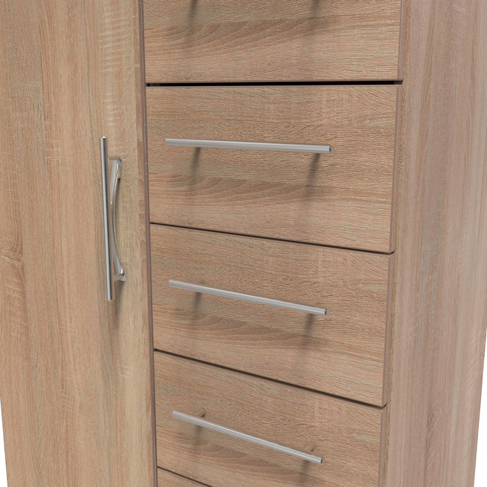 Add a touch of fun to your child's bedroom with the Crowndale Sherwood Single Door 6 Drawer Bardolino Oak Children Wardrobe. This compact midi wardrobe features a combination of six spacious drawers and a wardrobe compartment, making it an ideal solution for storing children's clothes or toys. Each drawer is adorned with sleek metal T-Bar handles and equipped with long-lasting metal runners and a linen-effect interior. Crafted in the United Kingdom to the highest quality standards, this elegant piece combines functionality with timeless design, ensuring it meets all your storage needs with style.
