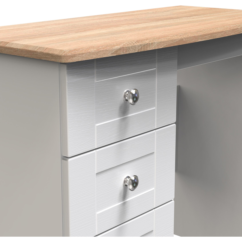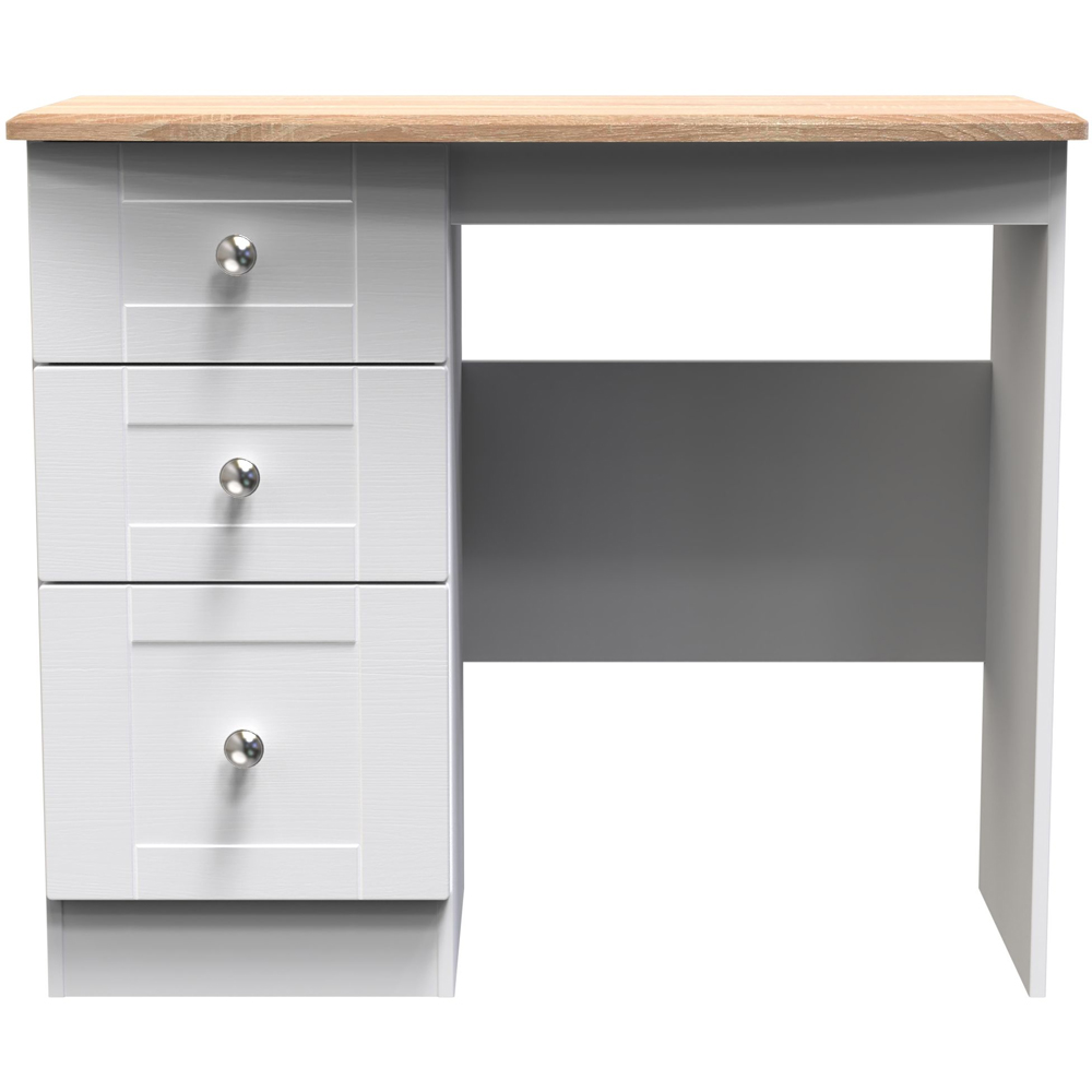 Add a touch of elegance to your space with the Crowndale Sussex 3-Drawer White Ash and Bardolino Oak Dressing Table. With a wood grain effect, panelled design, recessed fronts, contrasting wood top and chrome handles, this unit is practical and stylish in nature. Made in the United Kingdom with the highest quality material, the unit features a traditional design with block panel fronts and polished metal handles. Finished with smooth metal drawer runners and linen-effect drawer lining, the unit has a scratch-resistant surface. It is delivered directly to your location of choice by a two-man delivery team and comes fully assembled. Please note that any handles or legs may be removed during transit to avoid the risk of damage.