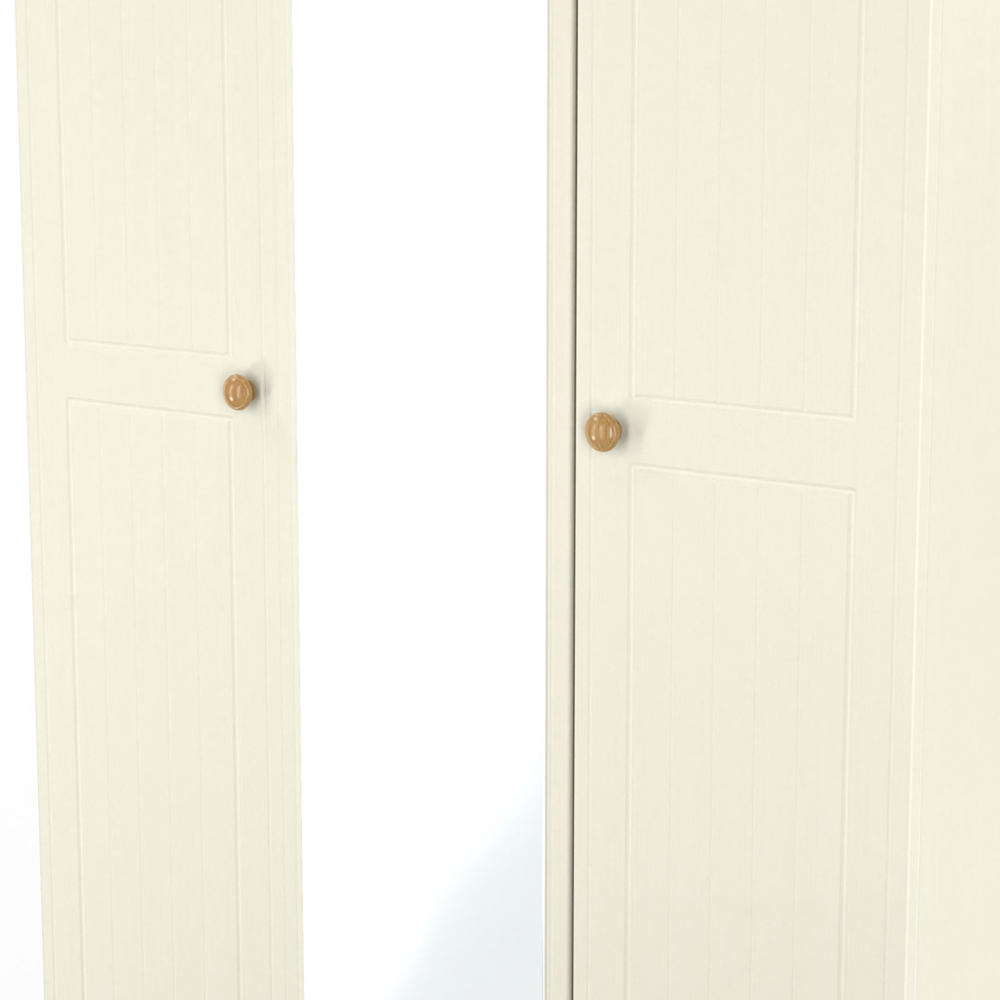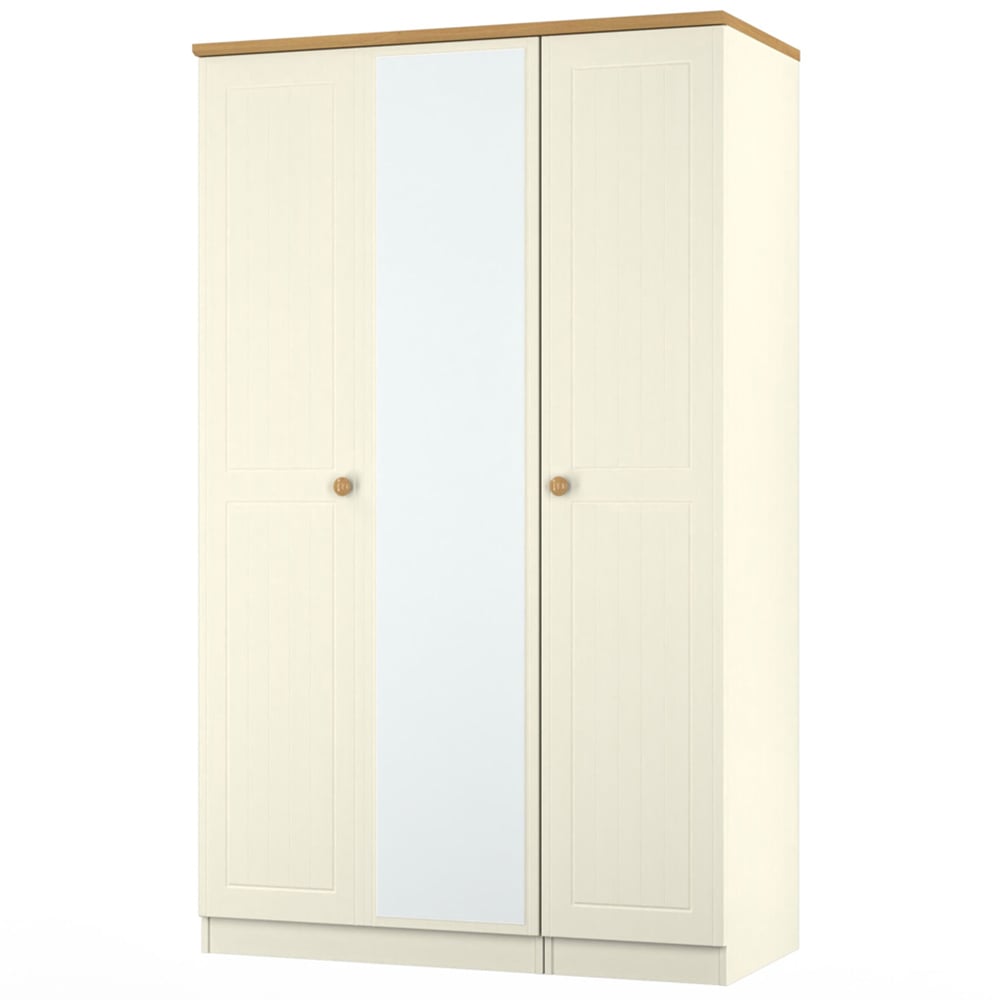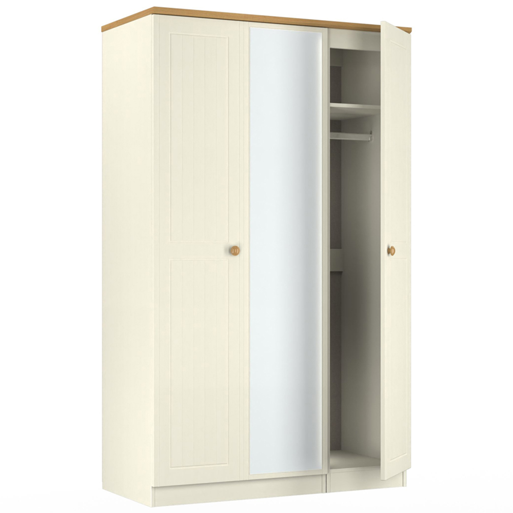 Perfect for any bedroom needing extra storage, the Crowndale Warwick 3 Door Cream Ash and Oak Triple Mirror Wardrobe offers full-height, triple-door capacity. This spacious wardrobe features a full-height single mirrored door, adding both functionality and elegance. Complemented by curved tops, its design is enhanced by delicate grooves. Optional contrasting oak effect tops and handles ensure it suits any interior decor. Made in the United Kingdom to the highest quality standards, this stunning piece combines practicality with timeless style.