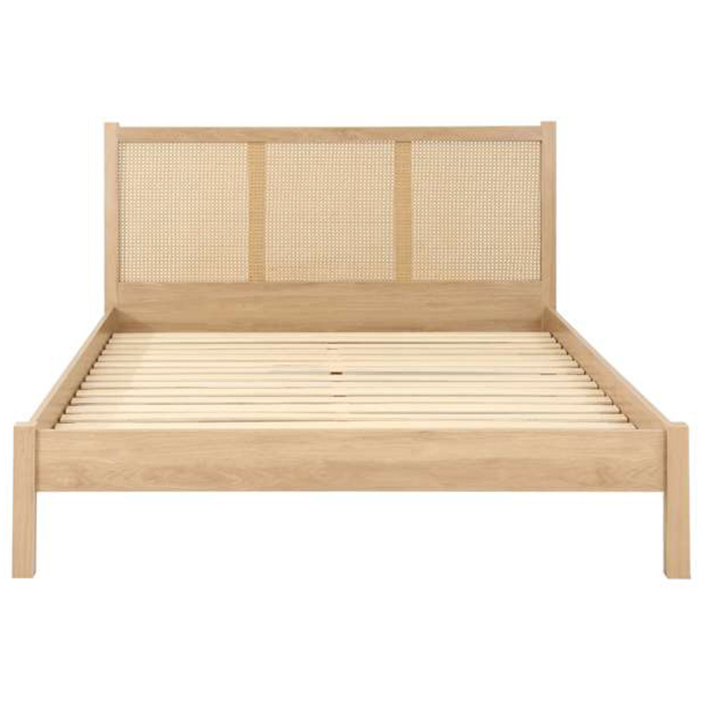 Elevate your bedroom decor with this Croxley King Size Oak Rattan Bed. Featuring a rattan headboard, this bed adds a bit of sunshine to your home. Classically styled, the bed will work equally well in a traditional or more contemporary interior. Also, it comes with wooden slats for mattress support and air circulation. Plus, the bed frame adds a natural, airy bedroom feel by day and warm tones for a cosy feel by night. Please note: beds are only suitable for a UK standard-size mattress, and the recommended maximum mattress height is 200mm.