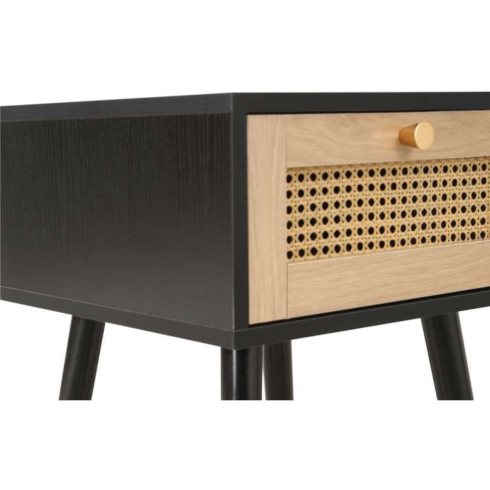 Declutter your space in style with this Croxley Single Drawer Black and Oak Rattan Bedside. Featuring rattan detailing in a black frame, this bedside adds a bit of sunshine to your home. Mix it with lush green plants and different shades of terracotta and burnt orange accenting accessories to complete the look. This bedside features a handy drawer finished with a beautiful gold handle that is ideal for storing belongings. Also, it comes with an open space underneath suitable for storing larger items. Plus, the bedside adds a natural, airy bedroom feel by day and warm tones for a cosy feel by night. Care instructions: Wipe carefully with a soft, dry cloth.