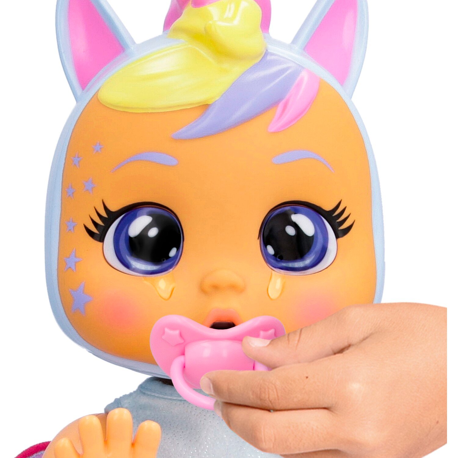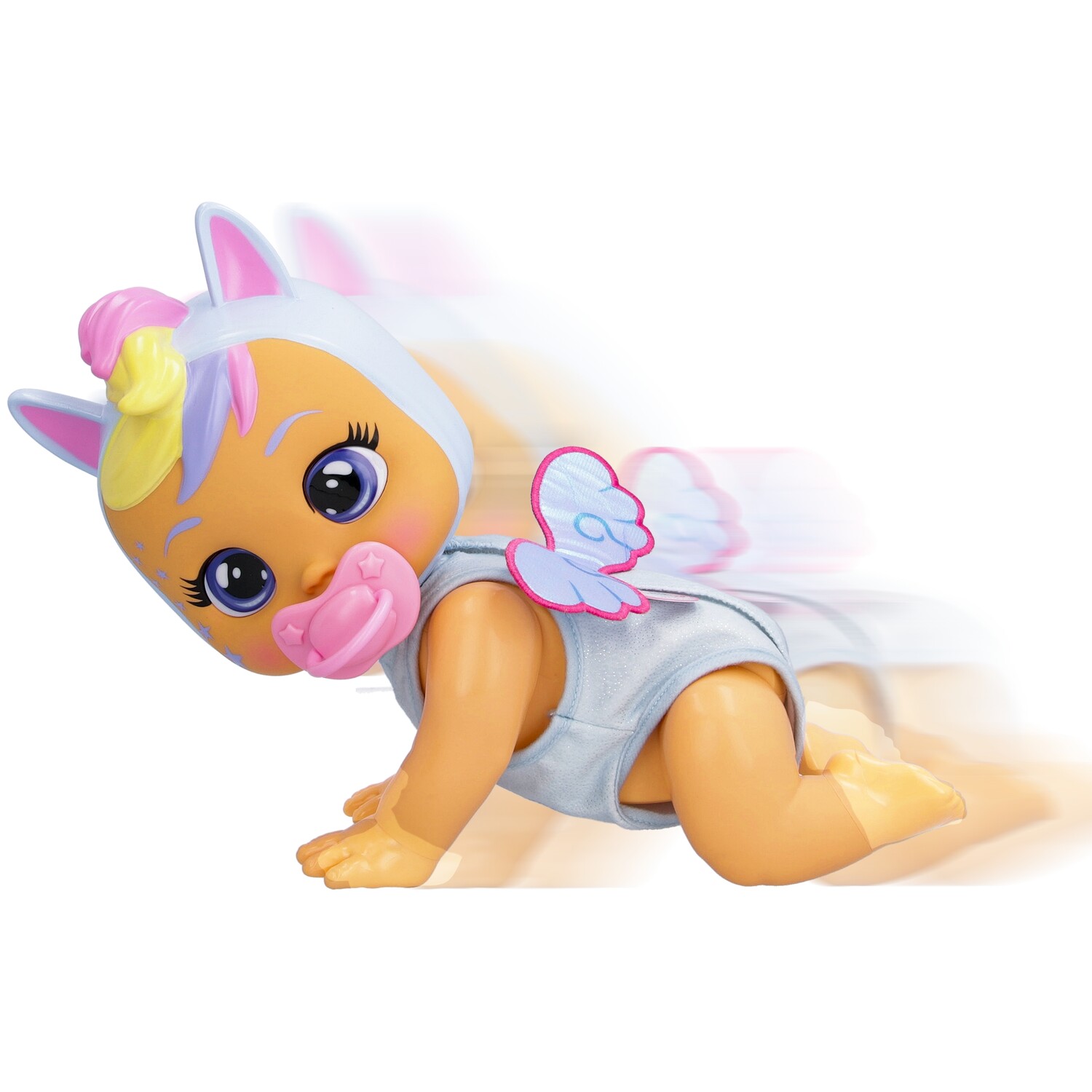 Discover the new Cry Babies Crawling Jenna! Jenna crawls across the floor and giggles like a real baby! To see Jenna crawl, simply press the cloud button on her back. Jenna has beautifully painted hair and eyes, plus a soft face! She comes dressed in her removable cute fantasy pyjamas and has a dummy and rattle! Sit Jenna up, and she'll move her arms to play with her rattle! Additionally, when kids lay Jenna down, she'll move her arms and legs and giggle! She makes 35 authentic baby sounds. Like all Cry Babies, she cries real tears when her dummy is removed. Put her dummy back to soothe Jenna and stop her crying.