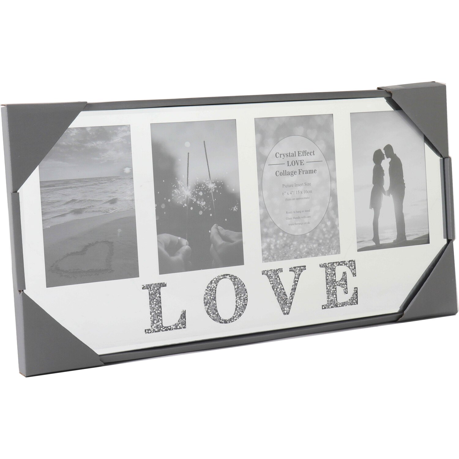 The Crystal Effect Love Collage Frame is a beautifully elegant way to put your favourite memories on display. This frame has a sleek silver colour scheme with a luxurious crystal accent in the word "love" written along the bottom. The frame fits four photos and is perfect for wedding, anniversary, christening, and birthday pictures. Easy to hang with the hooks on the back, it's the perfect addition to any space.