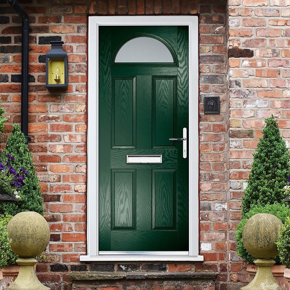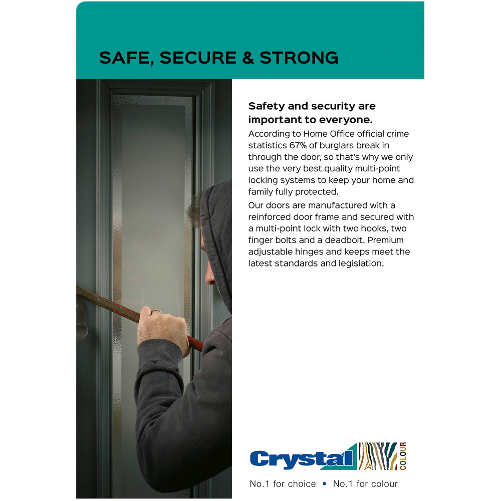 Welcome home with elegance and security, all in one door with Crystal GRP Composite Sunburst Green Left Hand 4 Square Obscure Glass Door 920 x 2055mm. It is double glazed using a high energy efficient toughened safety unit. The Glass Reinforced Plastic (GRP) skin and high density polyurethane foam core offer stability from the elements and water ingress, along with exceptional thermal efficiency helping to reduce energy bills. This door features high security hook locks and comes with handle, PVC cill. It measures 920 x 2055mm with the overall height including the cill. All product handings are viewed from the outside.