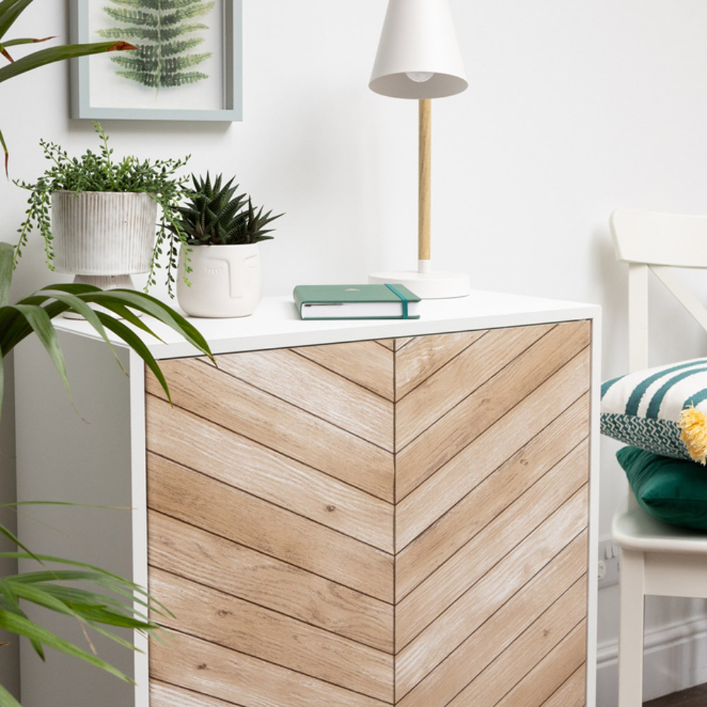Upgrade your home decor with this classic Chevron Natural Vinyl Film by d-c-fix. With an authentic look, this vinyl film is a great DIY product for covering surfaces around the home, such as kitchen doors, work surfaces, and furniture items, to give them a whole new look. This high-quality, German-manufactured film is self-adhesive, making it easy to apply. It can be repositioned during the application, so if you make a mistake, simply peel it back and re-apply. With a modern oak chevron wood effect feel, this film comes with a sticky back that can be removed, making it ideal for tenants. This film measures 67.5 x 15m in size and is heat resistant to 70°C and comes with a durable wipe-clean surface means it's easy to keep clean. Always remember to use mats for hot pans or food prep and seal around wet areas such as sinks and hobs with silicone for long-lasting use.