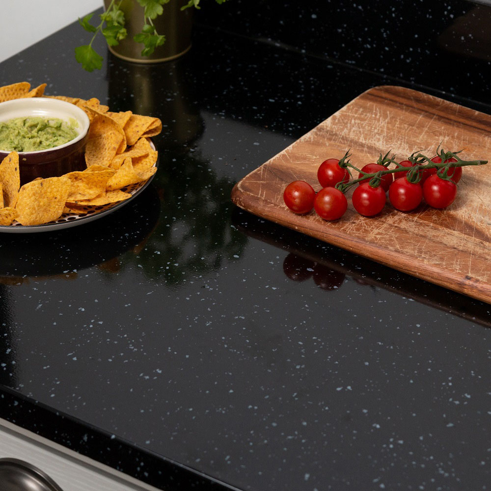 Get creative and redefine your space with this d-c-fix Black Granite Quartz Sticky Back Plastic Vinyl Wrap Film. This vinyl film is a versatile DIY product that can help you redefine your living space with ease. With a Quartz effect, this self-adhesive film is perfect for covering kitchen doors, work surfaces, and furniture. It's affordable and easy to apply and can be repositioned during installation, so you can fix any mistakes easily. Plus, it's heat-resistant up to 70°C and has a wipe-clean surface that's durable and easy to maintain. Always use mats for hot pans and food prep, and seal around wet areas like sinks and hobs with silicone. Size: 67.5cm x 15m.