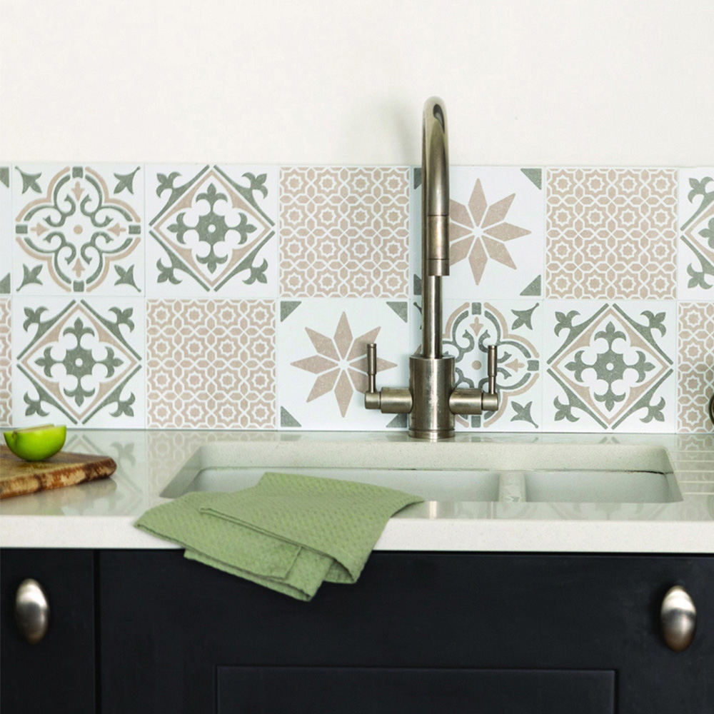 Go for the fast and fun way to refresh your space with the d-c-fix Jamila Natural Sticky Back Vinyl Wall Tiles. These self-adhesive wall tiles are the perfect DIY product for a quick, easy and affordable splashback makeover. The rigid vinyl tiles can applied to flat walls or over existing flat tiles to add instant colour and pattern. Choose one design or mix and match to create your style. As the tiles are nice and thick, they won't show the grout lines from the tiles underneath, and they can be removed, making it ideal for tenants. Banish outdated tiles and give your kitchen, bathroom or utility room an instant refresh with no mess or fuss. Size: 15 x 15cm. Pack of 18. Covers 0.42SQM.