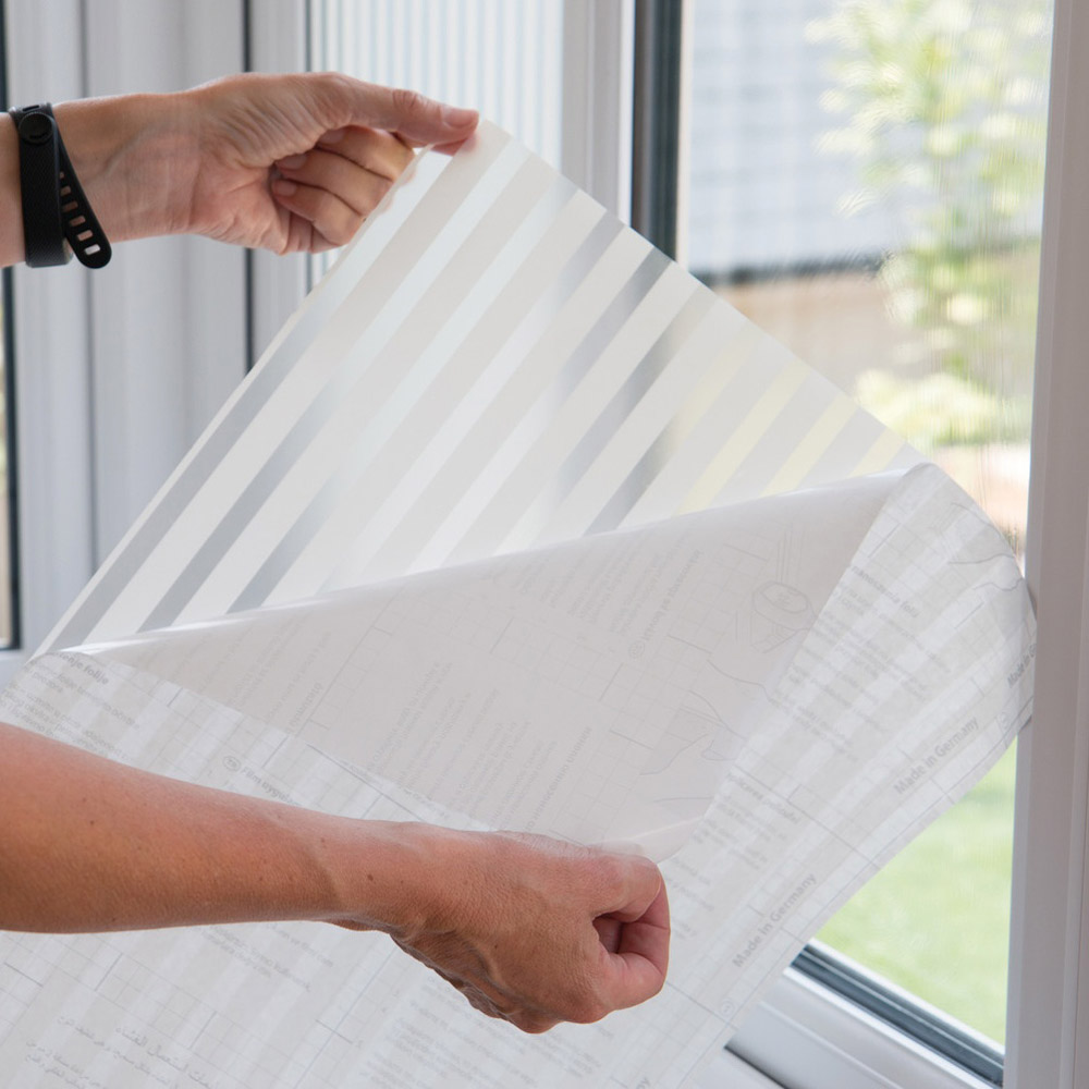 Give your windows a new look with the d-c-fix Linia Static Cling Vinyl Window Film 90cm x 1.5m. Linia is a striped static cling window film which can be used on windows, glass doors and even on the outside of shower screens to provide privacy and decoration without losing light. To apply the film, simply ensure the glass is clean and flat, measure the area to be covered, spray the glass with water, then peel away the backing paper and smooth the film into position. When cutting to size, allow a 2mm gap around each edge to ensure it doesn't overlap with the window seals, as it needs 100% contact with the glass to fully adhere. Use a squeegee to push any excess water to the edges, then wipe with a cloth and allow to dry fully for 24 hours. As well as privacy and decoration, the film also provides 95% UV protection, which helps prevent carpets and soft furnishings from fading. Cleaning is easy. Simply use a damp cloth and non-abrasive cleaning solution, and when it's time for a change, simply peel away from the glass without leaving any sticky residue - perfect for tenants! If rolled and stored correctly, the film can even be reused. Size: 90cm x 1.5m.