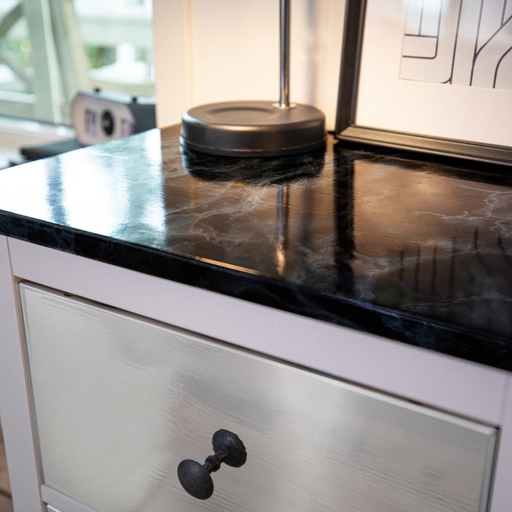 Restore worn-out surfaces with this d-c-fix Marble Black Sticky Back Plastic Vinyl Wrap Film. Stylish and functional, this is a peel-and-stick vinyl film with an authentic black marble effect. The vinyl film is a great DIY product for covering surfaces around the home such as kitchen doors and work surfaces. Also, it is useful for shielding items of furniture to give them a whole new look on a budget. Easy to use, the high-quality German-manufactured film is self-adhesive, making it easy to apply. Plus, it can be repositioned during application, so if you make a mistake, simply peel it back and re-apply. For added convenience, the film can be removed, making it an ideal option for tenants. This vinyl wrap film is heat resistant to 70°C and comes with a durable wipe-clean surface for simple maintenance. Please note: Always use mats for hot pans and food preparation and seal around wet areas such as sinks and hobs with silicone. Size: 67.5cm x 5m.