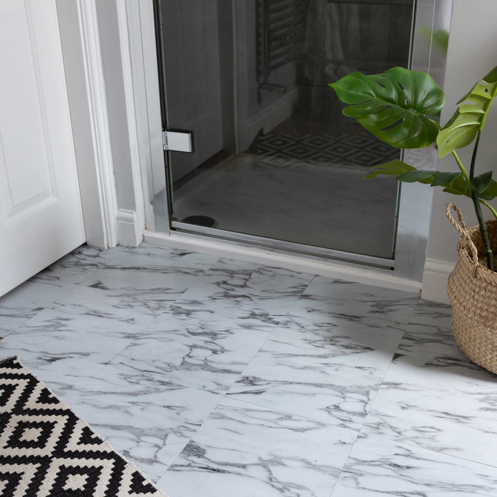 Upgrade your floors in an afternoon with the d-c-fix Marble Grey Sticky Back Vinyl Floor Tiles. Changing the floor can completely transform the look and feel of a room but can be costly, especially if it involves lifting old tiles and paying for labour. These self-adhesive rigid vinyl floor tiles can be laid over flat tiles and wooden floors without any specialist tools or a professional fitter. Simply peel and stick the tiles over the clean flat surface and butt join them together, and you don't even need to grout. To cut the tiles, simply score with a utility knife and snap, and the durable, water-resistant surface means they are easy to keep clean. Application instruction: Before application, ensure the surface is completely clean, dry and flat. The tiles are not suitable for use over lino or floating floors such as laminate. Hardboard can be laid first if necessary to create a suitable hard flat surface for the tiles to stick to. Size: 30.48 x 30.48cm. Pack of 33. Covers 3SQM.