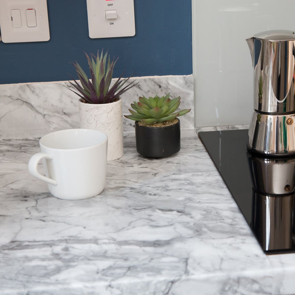 Restore worn-out surfaces with this d-c-fix Marble Romeo Grey Sticky Back Plastic Vinyl Wrap Film. Stylish and functional, this is a peel-and-stick vinyl film with an authentic marble effect featuring veins of luxurious metallic grey. The vinyl film is a great DIY product for covering surfaces around the home such as kitchen doors and work surfaces. Also, it is useful for shielding items of furniture to give them a whole new look on a budget. Easy to use, the high-quality German-manufactured film is self-adhesive, making it easy to apply. Plus, it can be repositioned during application, so if you make a mistake, simply peel it back and re-apply. For added convenience, the film can be removed, making it an ideal option for tenants. This vinyl wrap film is heat resistant to 70°C and comes with a durable wipe-clean surface for simple maintenance. Please note: Always use mats for hot pans and food preparation and seal around wet areas such as sinks and hobs with silicone. Size: 67.5cm x 10m.