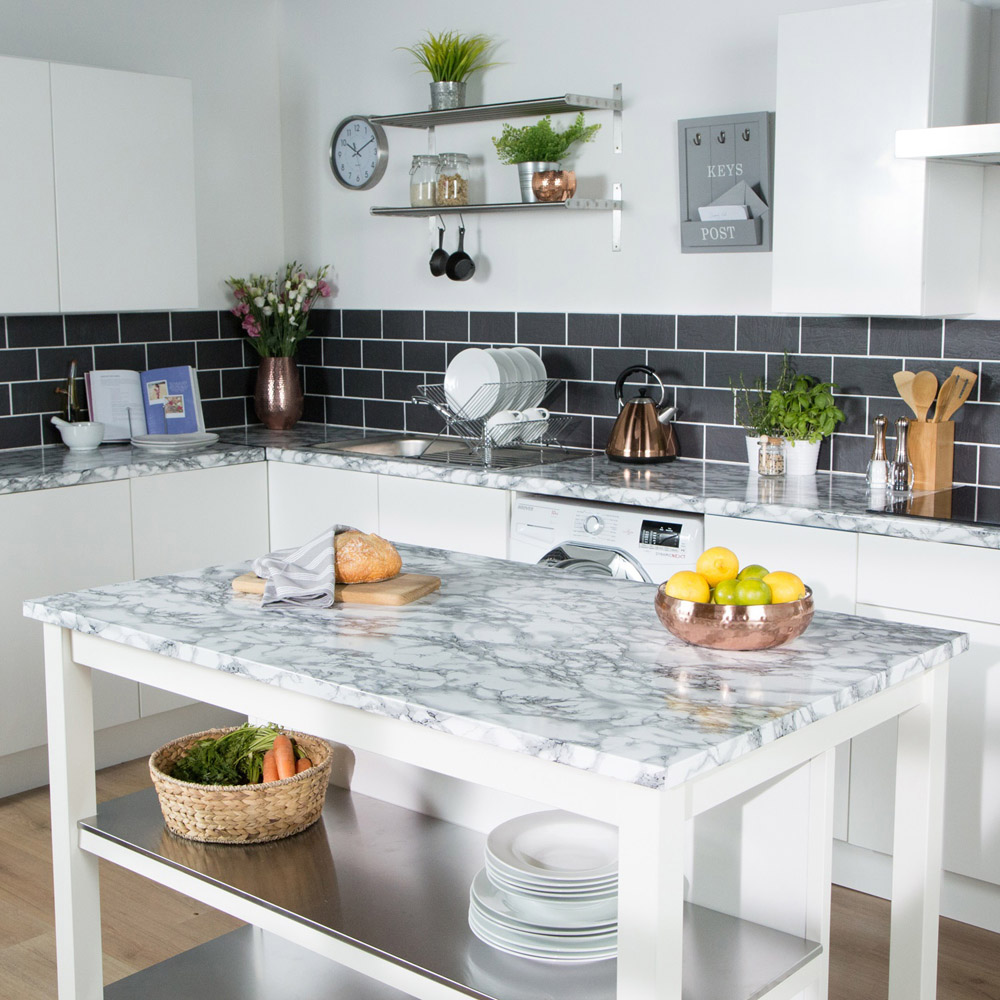 Restore worn-out surfaces with this d-c-fix Marble White Sticky Back Plastic Vinyl Wrap Film. Stylish and functional, this is a peel-and-stick vinyl film with an authentic marble effect. The vinyl film is a great DIY product for covering surfaces around the home such as kitchen doors and work surfaces. Also, it is useful for shielding items of furniture to give them a whole new look on a budget. Easy to use, the high-quality German-manufactured film is self-adhesive, making it easy to apply. Plus, it can be repositioned during application, so if you make a mistake, simply peel it back and re-apply. For added convenience, the film can be removed, making it an ideal option for tenants. This vinyl wrap film is heat resistant to 70°C and comes with a durable wipe-clean surface for simple maintenance. Please note: Always use mats for hot pans and food preparation and seal around wet areas such as sinks and hobs with silicone. Size: 67.5cm x 15m.