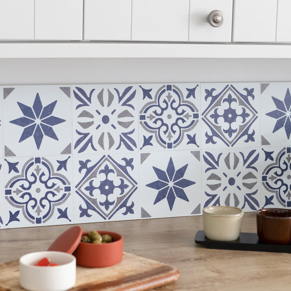 Go for the fast and fun way to refresh your space with the d-c-fix Nadia Blue Sticky Back Vinyl Wall Tiles. These self-adhesive wall tiles are the perfect DIY product for a quick, easy and affordable splashback makeover. The rigid vinyl tiles can applied to flat walls or over existing flat tiles to add instant colour and pattern. Choose one design or mix and match to create your style. As the tiles are nice and thick, they won't show the grout lines from the tiles underneath, and they can be removed, making it ideal for tenants. Banish outdated tiles and give your kitchen, bathroom or utility room an instant refresh with no mess or fuss. Size: 15 x 15cm. Pack of 18. Covers 0.42SQM.