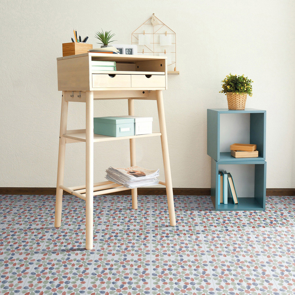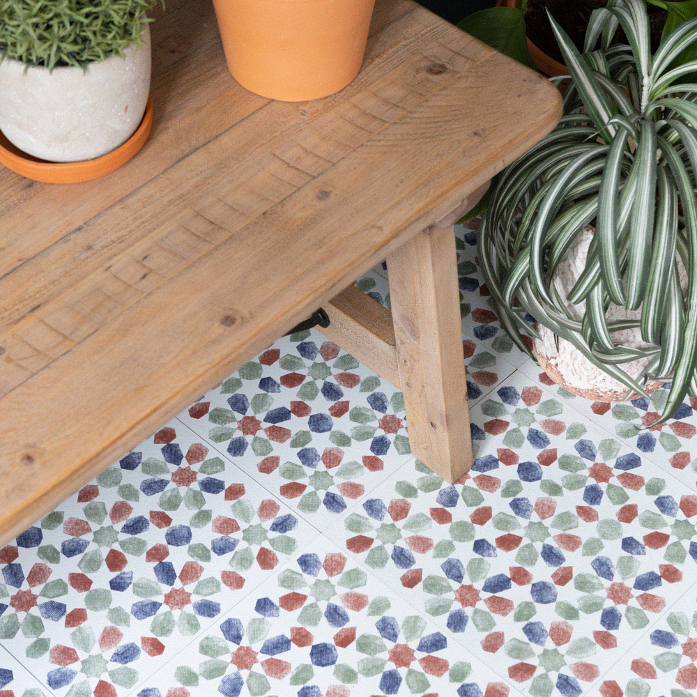 Upgrade your floors in an afternoon with the d-c-fix Spanish Leaves Sticky Back Vinyl Floor Tiles. Changing the floor can completely transform the look and feel of a room but can be costly, especially if it involves lifting old tiles and paying for labour. These self-adhesive rigid vinyl floor tiles can be laid over flat tiles and wooden floors without any specialist tools or a professional fitter. Simply peel and stick the tiles over the clean flat surface and butt join them together, and you don't even need to grout. To cut the tiles, simply score with a utility knife and snap, and the durable, water-resistant surface means they are easy to keep clean. Application instruction: Before application, ensure the surface is completely clean, dry and flat. The tiles are not suitable for use over lino or floating floors such as laminate. Hardboard can be laid first if necessary to create a suitable hard flat surface for the tiles to stick to. Size: 30.48 x 30.48cm. Pack of 33. Covers 3SQM.