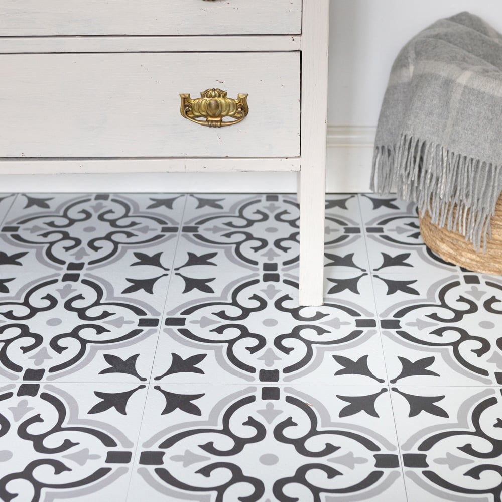 Upgrade your floors in an afternoon with the d-c-fix Stencil Motif Grey Sticky Back Vinyl Floor Tiles. Changing the floor can completely transform the look and feel of a room but can be costly, especially if it involves lifting old tiles and paying for labour. These self-adhesive rigid vinyl floor tiles can be laid over flat tiles and wooden floors without any specialist tools or a professional fitter. Simply peel and stick the tiles over the clean flat surface and butt join them together, and you don't even need to grout. To cut the tiles, simply score with a utility knife and snap, and the durable, water-resistant surface means they are easy to keep clean. Application instruction: Before application, ensure the surface is completely clean, dry and flat. The tiles are not suitable for use over lino or floating floors such as laminate. Hardboard can be laid first if necessary to create a suitable hard flat surface for the tiles to stick to. Size: 30.48 x 30.48cm. Pack of 33. Covers 3SQM.