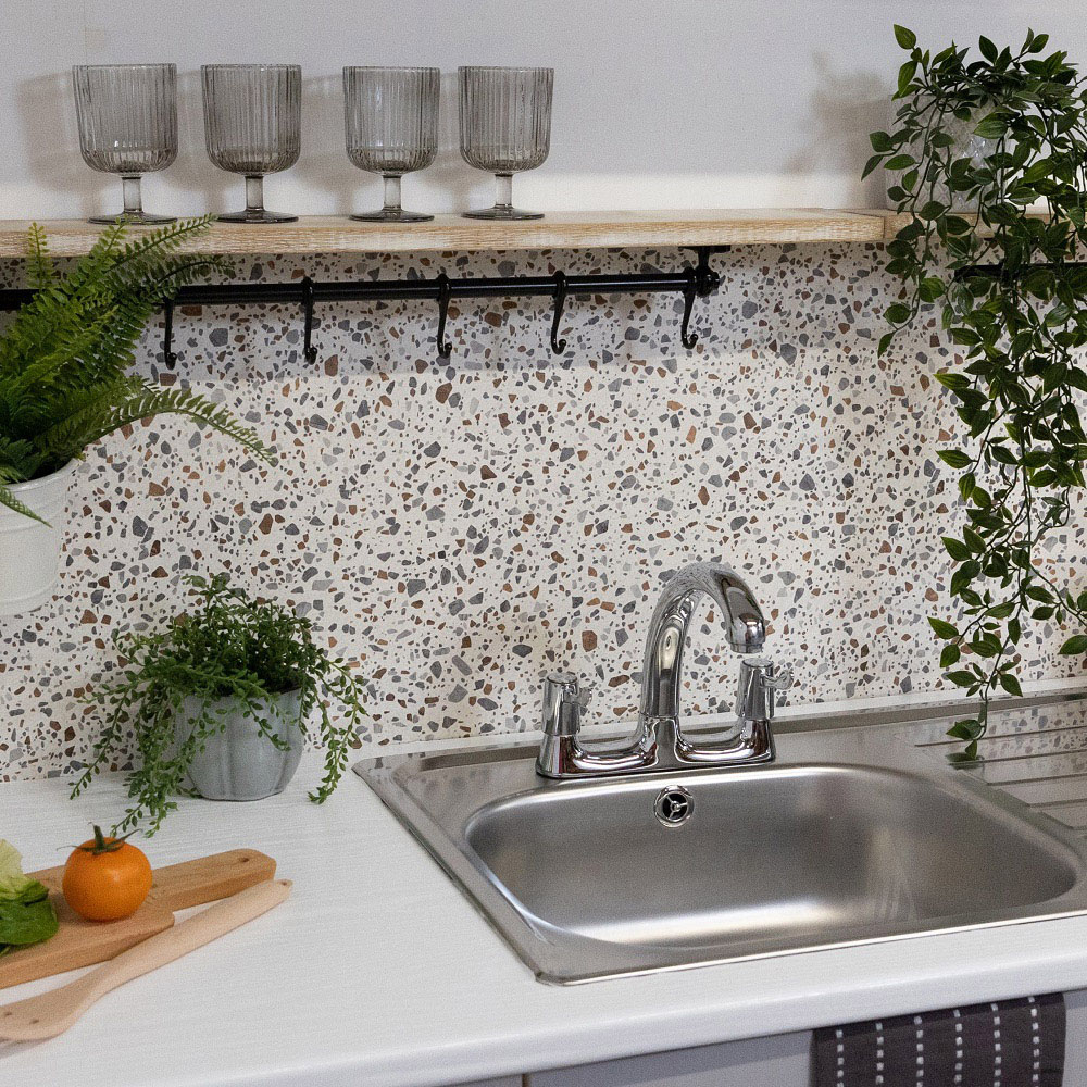 Restore worn-out surfaces with this d-c-fix Terrazzo Sticky Back Plastic Vinyl Wrap Film. Stylish and functional, this is a peel-and-stick vinyl film with an authentic Italian terrazzo stone effect. The vinyl film is a great DIY product for covering surfaces around the home such as kitchen doors and work surfaces. Also, it is useful for shielding items of furniture to give them a whole new look on a budget. Easy to use, the high-quality German-manufactured film is self-adhesive, making it easy to apply. Plus, it can be repositioned during application, so if you make a mistake, simply peel it back and re-apply. For added convenience, the film can be removed, making it an ideal option for tenants. This vinyl wrap film is heat resistant to 70°C and comes with a durable wipe-clean surface for simple maintenance. Please note: Always use mats for hot pans and food preparation and seal around wet areas such as sinks and hobs with silicone. Size: 67.5cm x 10m.
