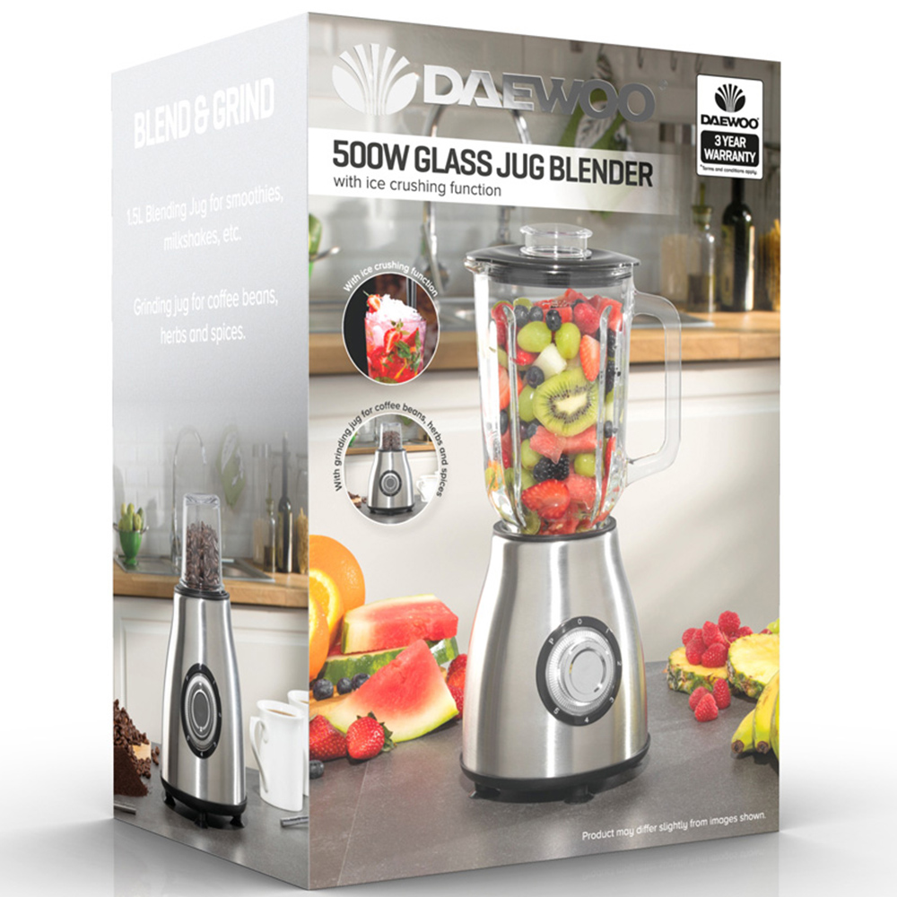 Create smoothies and other blended drinks with ease using Daewoo Glass Jug Blender 500W. With its large 1.5L capacity, the blender is designed with safety and durability in mind, featuring rust-proof stainless steel blades and a safety micro switch. It also comes with convenient features such as an easy-pour spout, measuring marks on the jug, and heavy-duty non-slip feet, making it user-friendly and practical. In addition to its impressive capacity and safety features, this blender is also highly versatile. It offers five speed settings plus a pulse function, allowing you to achieve the perfect consistency for your blends. The sharp and effective stainless steel blades effortlessly chop through various fruits and vegetables, grind spices and coffee beans, and even crush ice. This multifunctional design makes the blender an indispensable tool in any kitchen. Elevate your blending experience with the jug blender. The product comes with 3 year warranty.