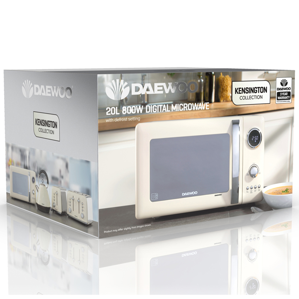 Enhance your cooking experience with the Daewoo Kensington Cream Digital Microwave. With five power settings and a defrost function, you can easily heat any type of food to perfection. The microwave's 800W power capabilities ensure quick and convenient heating of your favourite meals, snacks, or beverages. Its 20L capacity allows for the comfortable fitting of a standard-sized dinner plate or dish, making it ideal for reheating meals.
