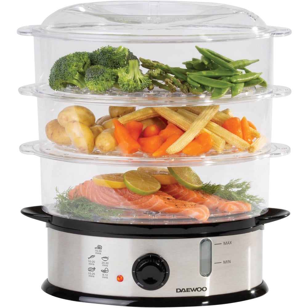 Get the perfect kitchen assistant for healthy food with the Daewoo SDA1338GE 9L 3 Tier Food Steamer. With a generous 9L capacity and three dishwasher-safe removable tiers, you can now cook multiple foods at the same time without compromising on taste or nutrition. Steaming is considered one of the healthiest and most versatile ways of cooking, as it uses no fats or oils and retains many of a food's nutrients. Whether you're cooking vegetables, rice, meats or fish, this food steamer has got you covered. It features a timer that allows you to steam from 0 to 30 minutes, with an auto shut-off when the timer runs out or the basin uses all the water. Moreover, you can leave your food to cook safely for up to 60 minutes before the steamer automatically switches off. Get your hands on this amazing food steamer today and cook healthy, delicious meals for you and your family.