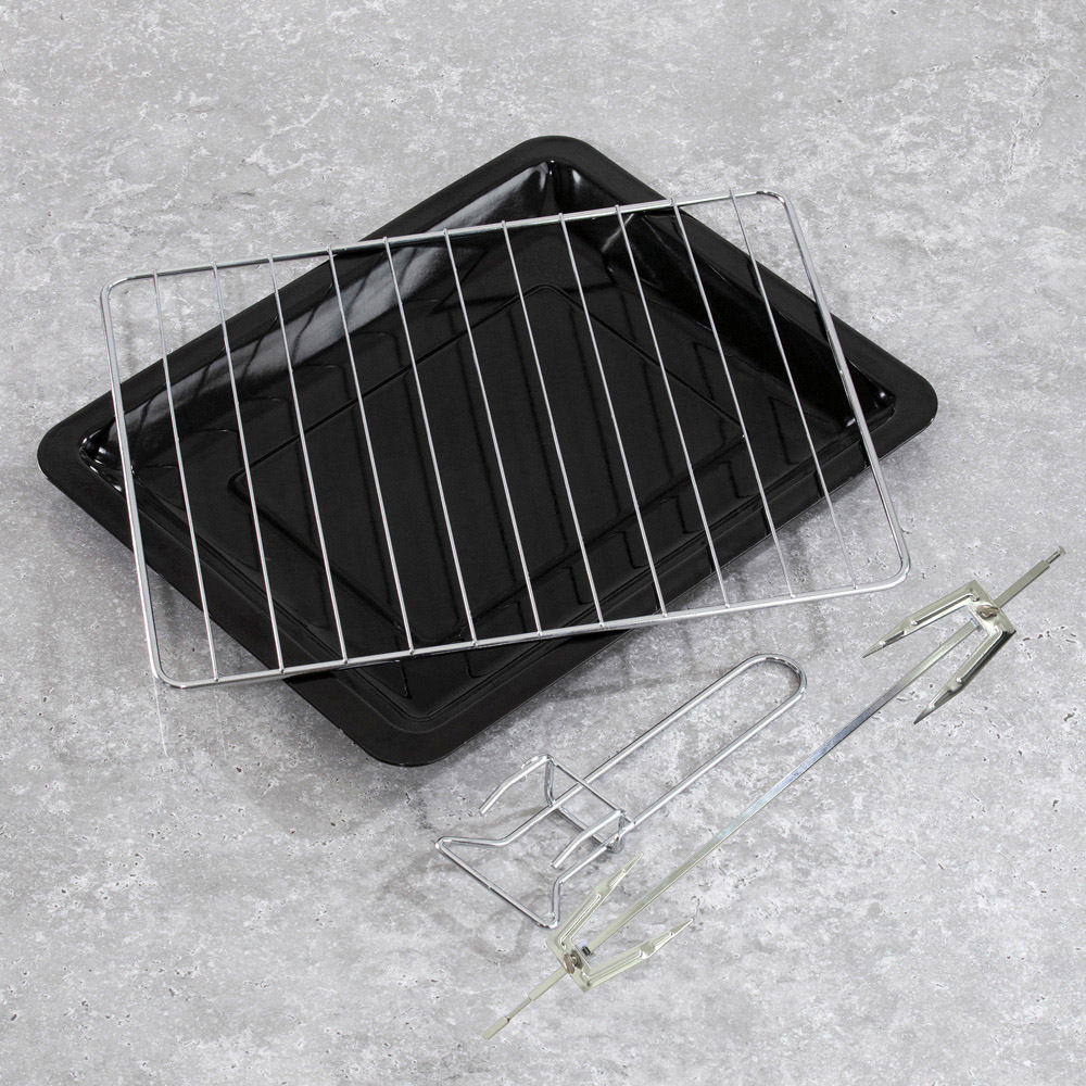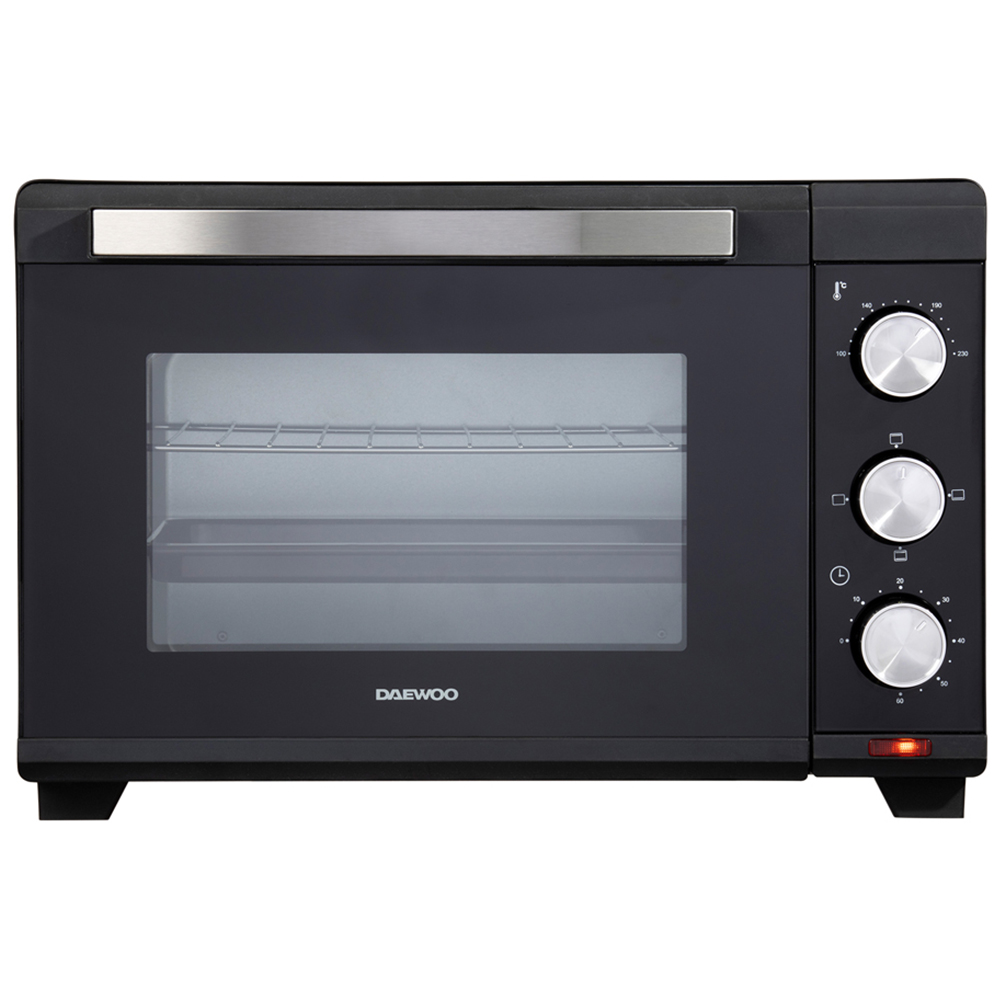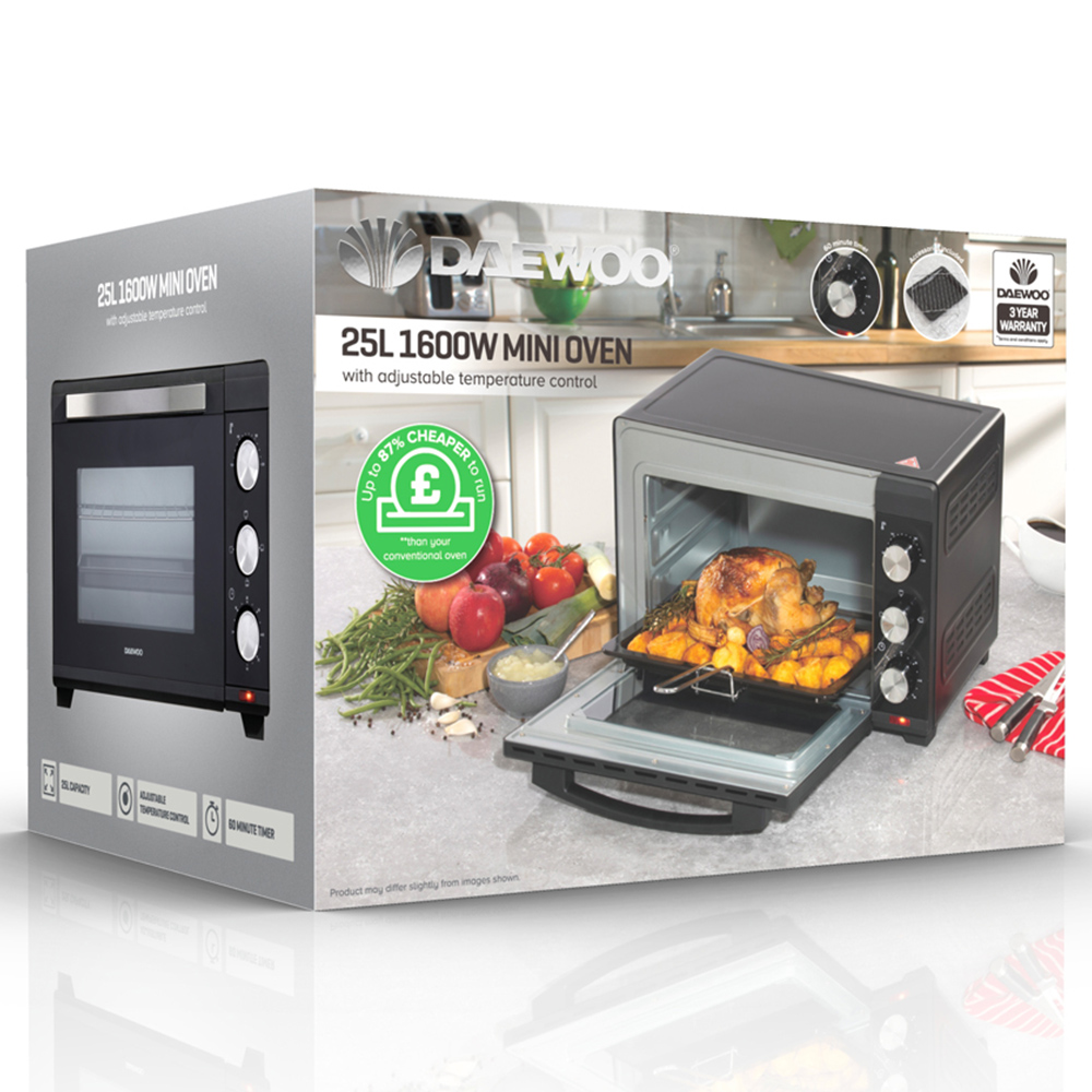 Compact and Versatile Cooking Introducing the Daewoo 1600W 25L Electric Mini Countertop Oven & Grill, the perfect solution for those who need the functionality of a full-sized oven but in a compact, space-saving design. Ideal for caravans, motorhomes, or small kitchens, this mini oven delivers powerful cooking capabilities without compromising on space. Adjustable Cooking Settings With adjustable temperature settings ranging from 100°C to 230°C, you can roast, grill, or bake with precision using either the top or bottom heating elements, or both at the same time. The 60-minute timer ensures that your dishes are cooked to perfection every time, whether you're preparing a quick meal or a slow-cooked roast. Handy Accessories The oven comes equipped with a grill tray, roasting rack, and a detachable handle, making it easy to remove food safely.