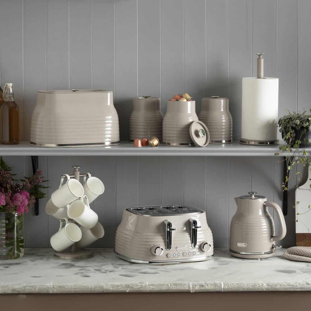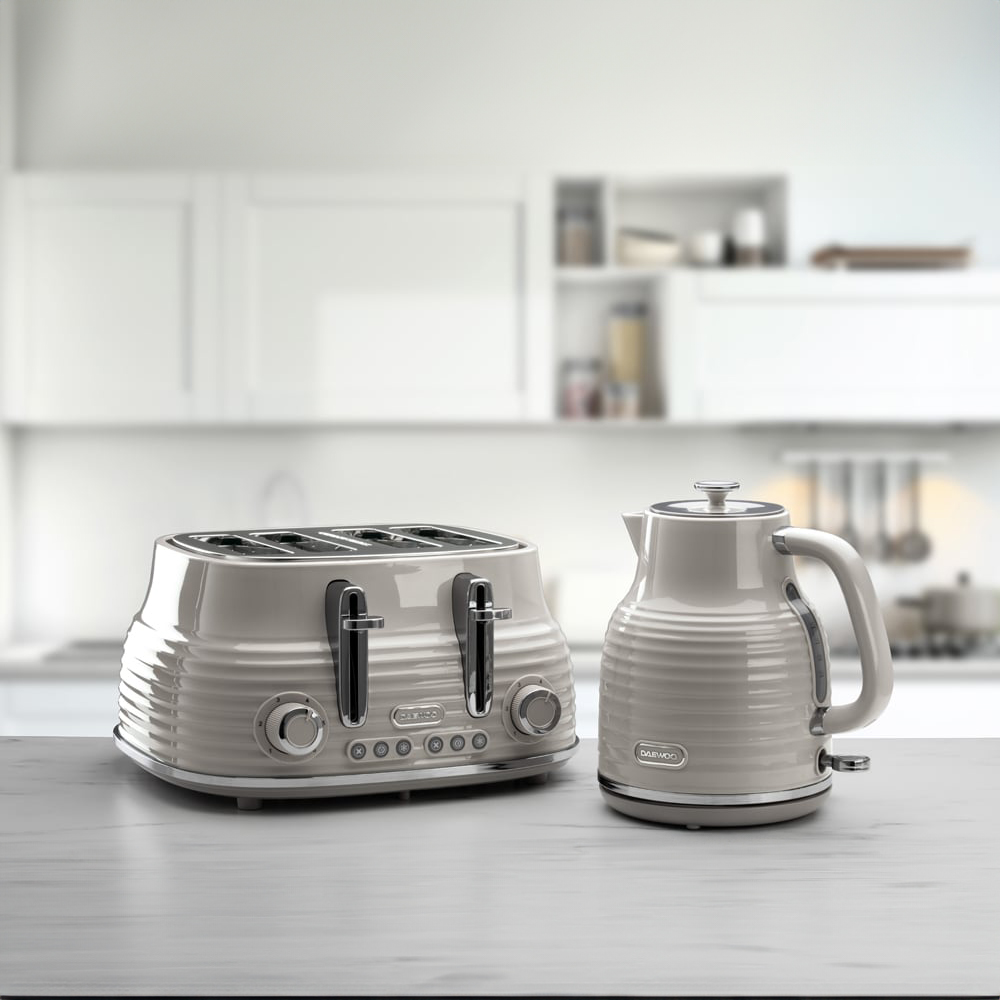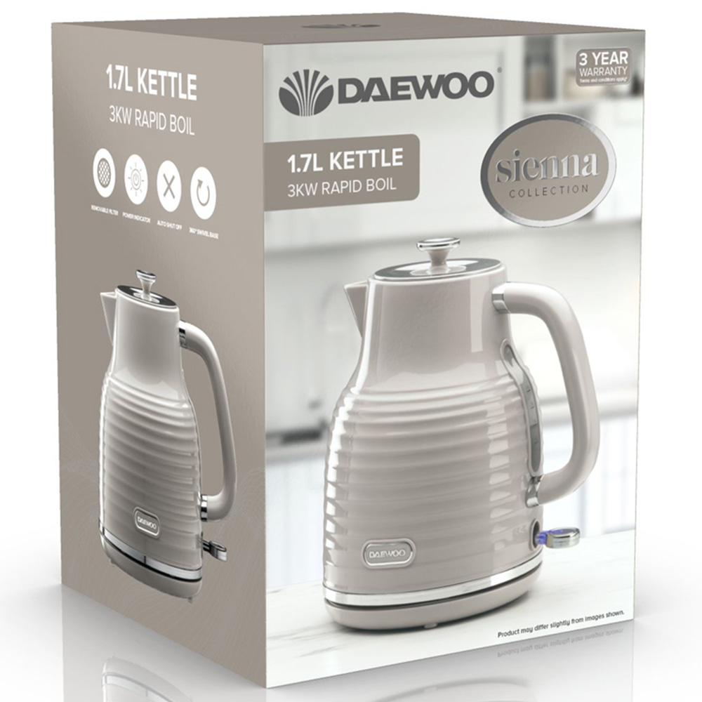 Introduce a touch of elegance and practicality to your kitchen by adding the Daewoo Sienna Taupe Rapid Boil Jug Kettle. This exquisite kettle showcases a classic lift-off lid and a textured body adorned with ridges. Designed with convenience in mind, it is cordless and boasts a 360-degree design, catering to both left and right-handed individuals. The impressive 3kw element ensures a speedy boil, eliminating any unnecessary waiting time for your hot beverage. With its generous capacity, it can accommodate approximately seven cups of water, making it ideal for the entire family. Additionally, the kettle is equipped with a transparent water fill indicator on the side, a power-on LED indicator, and a removable limescale filter. The product comes with 3 year warranty. Embrace the rapid boiling capabilities and practicality of this jug kettle.