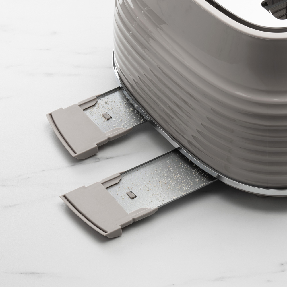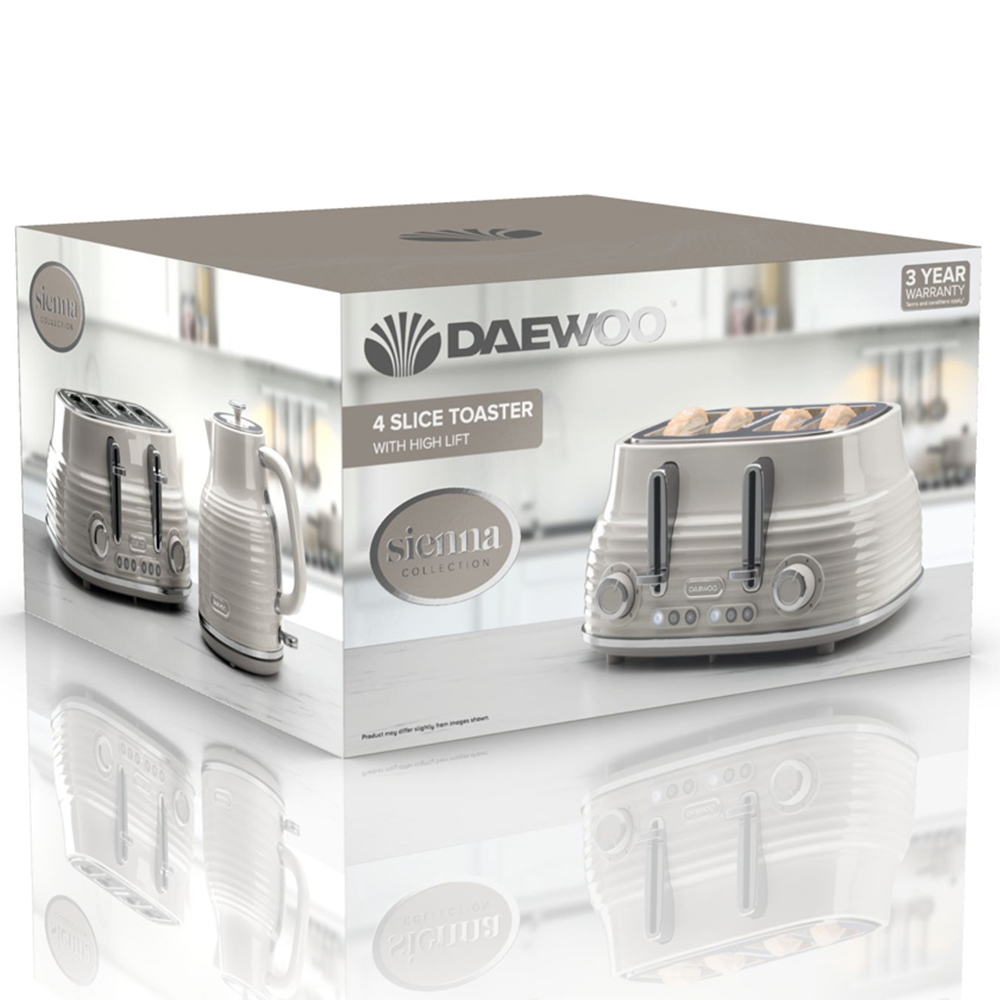 Make a stylish and practical addition to your kitchen with the Daewoo Sienna Taupe 4 Slice Toaster. With its unique design featuring embossed ridges and a gently curved shape, this toaster is sure to stand out in any kitchen. Specifically designed for family use, it comes with separate controls for each pair of toasting slots. Offering six browning settings and additional options for reheating, defrosting, and cancelling, this toaster provides both versatility and convenience. The high-lift handle ensures easy retrieval of your toast, while the two removable crumb trays make cleaning a breeze. Whether you're preparing breakfast for the entire family or just a few slices for yourself, this large four slice toaster is perfect for any occasion. Enjoy precise control over your toasting preferences with the six levels of browning, and take advantage of the individual controls and LED power indicator lights for each two-slice slot. Rest assured with the included 3-year warranty, knowing that your toaster is built to last.