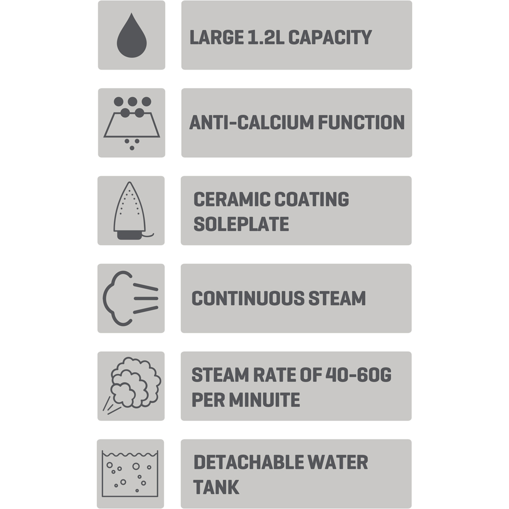 Tackle your ironing tasks effortlessly with the Daewoo Steam Generator Iron Station 2400W. Equipped with a spacious 1.2L water tank, you can enjoy uninterrupted ironing sessions without the need for frequent refills. Its ceramic coated soleplate ensures smooth and gentle ironing, while the high output of continuous steam at 40 to 60g per minute guarantees efficient wrinkle removal. Additionally, the anti-calcium technology extends the lifespan of your iron. This iron also comes with a 3-year warranty for added peace of mind.
