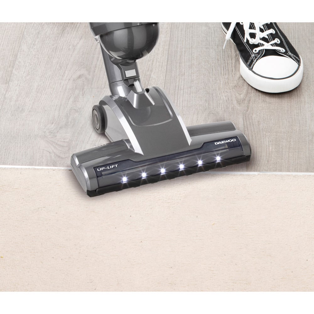 Achieve a thorough and efficient cleaning with the Daewoo Tornado Up Lift Cordless Vacuum Cleaner 600W. This corded and upright vacuum is a powerhouse, providing quick and efficient floor cleaning with ease. With built-in LED lights for enhanced visibility, it uncovers hidden dust and debris under furniture effortlessly. The detachable handheld unit adds convenience, while the powerful 22.2V 2000mAh battery ensures an impressive run time of up to 40 minutes. The two-speed settings and LED lights ensure no dust or debris is left behind. The 2-in-1 feature allows for easy detachment of the handheld vacuum, making it perfect for hard-to-reach areas such as corners, stairs, sofas, or curtains. The crevice and upholstery tools make a noticeable difference, ensuring a thorough clean every time. With the unique multidirectional swivel head and folding flexi-hinge handle, effortless manoeuvrability is guaranteed, making it adept at reaching under furniture.