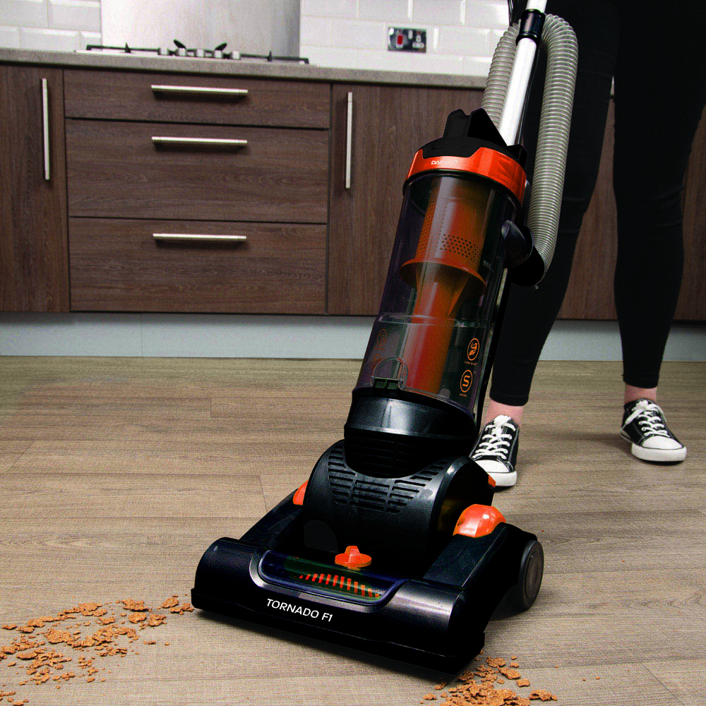 Achieve a thorough and efficient cleaning process with the Daewoo Upright Vacuum Cleaner 750W. It is equipped with a washable HEPA filter, a 2 in 1 crevice and upholstery brush, an air turbo 2 in-1 pet and stair brush, and cyclonic suction technology. These features work together to ensure a cleaner and healthier household by addressing allergens, hard-to-reach areas, and pet hair. Additionally, the vacuum cleaner delivers optimal performance on various floor types. With its HEPA filter, it effectively sifts through the finest allergens and debris, resulting in a cleaner household. The 2 in 1 crevice and upholstery brush allows you to easily tackle hard-to-reach areas such as stairs, sofas, corners, and curtains. This versatile attachment makes a noticeable difference in your cleaning routine. Furthermore, the air turbo 2 in 1 pet and stair brush provides concentrated suction, effortlessly removing pet hair from carpets, stairs, and upholstery. The product comes with 3 year warranty.