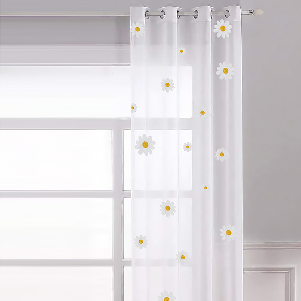 Enhance any room's ambience with the Daisy Embroidered Voile Curtain. This minimalist curtain showcases carefully embroidered white daisies while its sheer fabric lets the sunrays dance in your home beautifully. Just drape them in your living room or bedroom to create an airy, dreamlike atmosphere in your home.